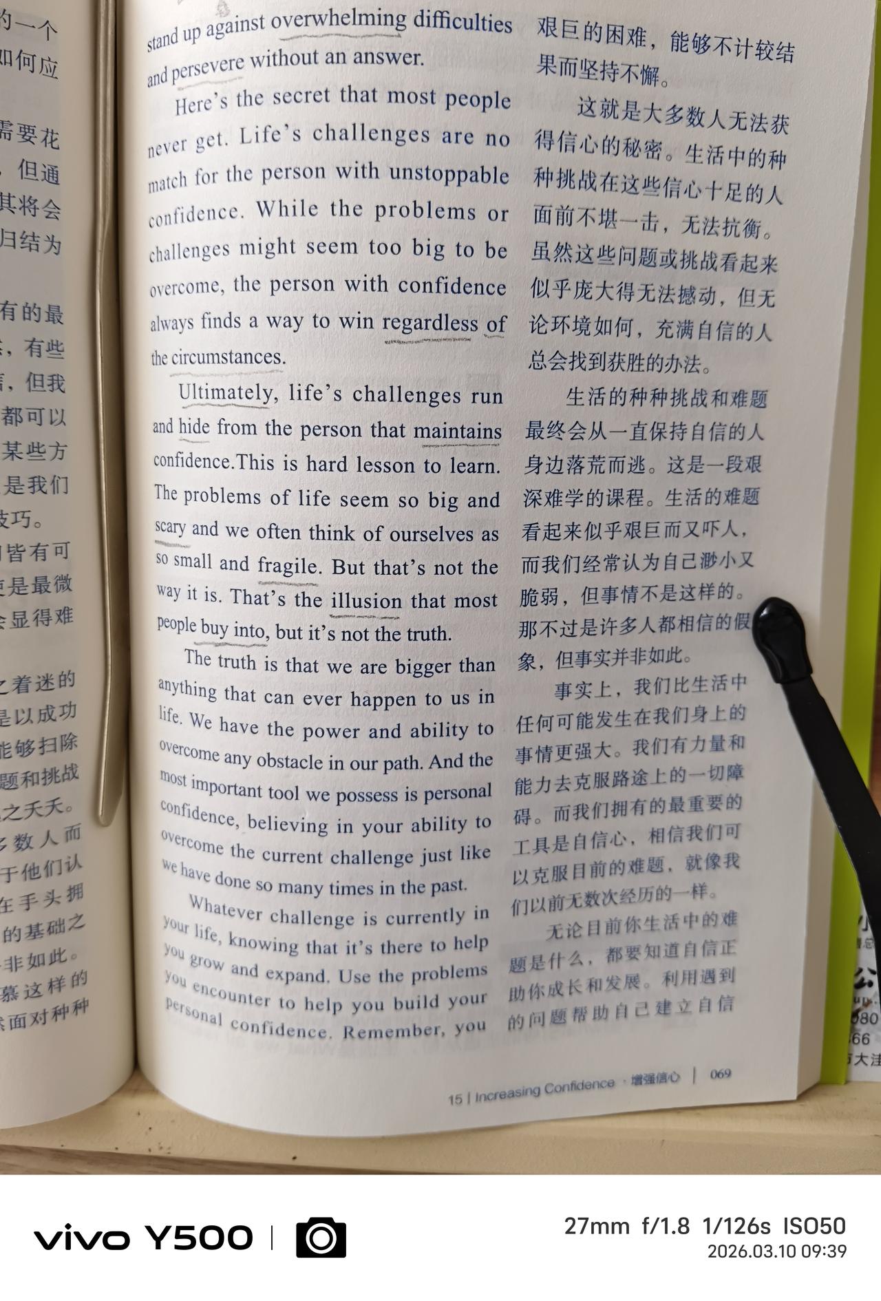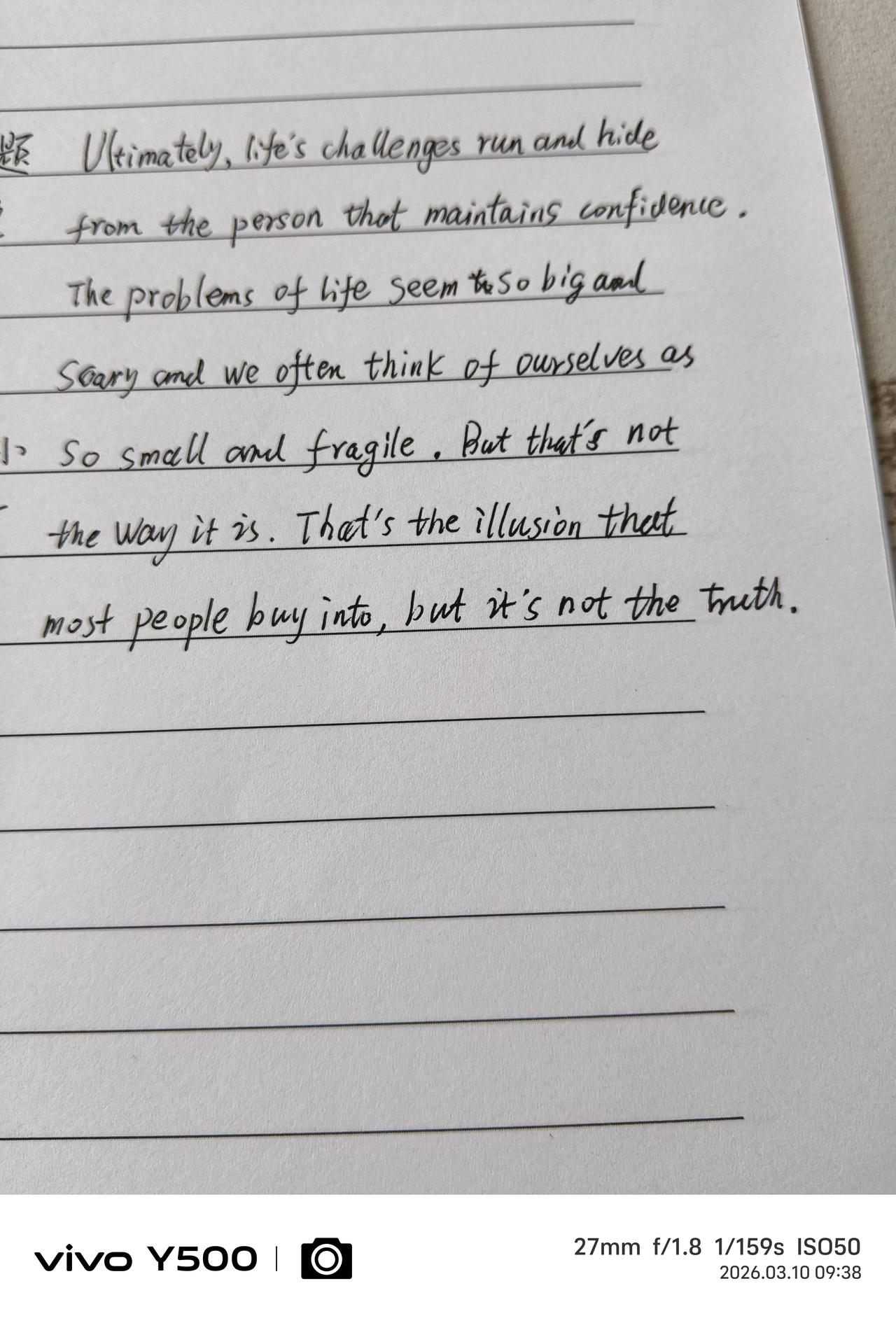 看到一段话很励志,把它抄下来: 生活的种种挑战和难题,最终会从一直保持自信的人身边落荒而逃。 生活的难题看起来似乎艰巨而又吓人,而我们经常认为自己渺小又脆弱,但事情不是这样的,那不过是许多人都相信的假象,但事实并非如此。 ——真的是这样,我们常常低估了自己,被自己设定的虚幻的困难吓倒。 信心,是人生的秘诀。