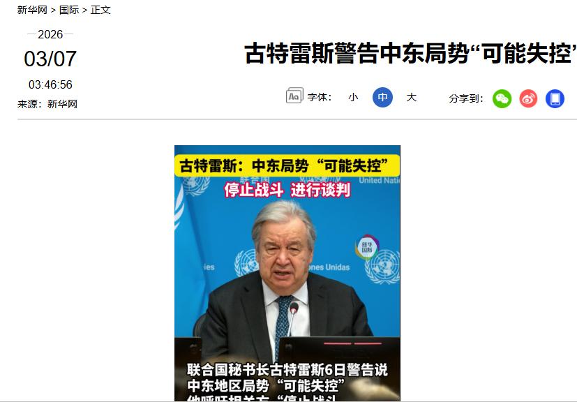 仗打到第八天,联合国终于不再沉默,秘书长古特雷斯公开警告,中东局势 “可能失控”,并紧急呼吁各方立刻停火,回到谈判桌前,这声迟来的呼吁,恰恰说明战火已经烧到了所有人都无法忽视的地步。 这事儿得从2月28号凌晨说起,美国与以色列陡然发动袭击,对伊朗23处军事目标进行猛烈轰炸,核设施、导弹基地以及革命卫队指挥部皆在劫难逃。 即刻开启“真实承诺4”行动,于八天内开展25轮轰炸,无人机与导弹轮番上阵,美军中东基地、以色列本土及海湾国家目标皆受打击,战火在这片土地肆意蔓延。 最狠的是3月5号这天,伊朗往科威特的美军基地扔导弹,把空战中心、卫星通信这些关键设备全干废了。 油价最先坐不住,布伦特原油从78美元一桶,八天涨到102美元,欧洲天然气更夸张,一天涨15%。 荷兰银行算过账:要是霍尔木兹海峡真被封,油价能冲到150美元!欧洲本来就缺能源,这下更惨,德国被迫重启煤电厂,法国核电站维护都推迟了。 老百姓更苦,联合国说,光黎巴嫩就有12万人逃难,加沙地带的医院快没药了,最绝的是,约旦、阿联酋这些国家因为不安全,把伊朗选民的海外投票站都关了,连哈萨克斯坦宪法公投都受影响。 眼看着要失控,欧盟赶紧开会,3月9号,欧盟理事会主席和委员会主席拉着中东国家开视频会,提出"三步降温":先停火,再划军事缓冲区,最后重启伊核协议谈判。 中国这时候站出来了,3月4号到9号,王毅外长跟沙特、伊朗、法国等七国外长打电话,提出"三不原则":不能乱打平民,不能单方面改变现状,不能把核问题扯进来。 中国特使翟隽9号晚上就飞到大马士革,准备去伊朗、沙特、埃及这些国家劝和。 看着中东这烂摊子,最难受的是老百姓,加沙的母亲抱着饿哭的孩子,贝鲁特的老人看着被炸塌的房子,德黑兰的学生担心明天还能不能上学,这些画面比啥数据都扎心。 美国总说"精准打击",可八天里伊朗3643处民用设施被毁,黎巴嫩217条人命没了,这叫精准?以色列说"自卫",可炸学校、袭击大使馆,这算哪门子自卫?伊朗报复是狠,但用无人机炸平民区,也不光彩。 最搞笑的是,联合国喊停火时,美国还在往中东运"爱国者"导弹,以色列在动员10万预备役,伊朗在忙着选最高领袖,都在为长期打架做准备,没人真想坐下来谈。 历史早就证明,中东问题靠打解决不了,1973年赎罪日战争、1982年黎巴嫩战争、2006年黎以冲突,哪次不是打得头破血流,最后还得谈? 现在更复杂了,核威胁、代理人战争、外国势力掺和,但核心没变:得承认大家都有安全需求,得建个能让所有人都安心的安全机制,才能跳出"打架-报复-再打架"的死循环。 咱们普通人虽然管不了大人物,但至少能说句公道话:别为了石油让老百姓遭罪,别为了面子让孩子没家,别为了争口气把核弹引爆,和平不是软弱,是对生命最基本的尊重。