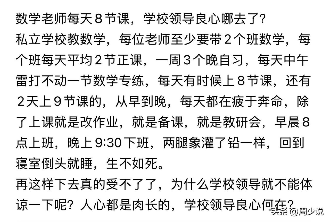 “实在撑不住了!”一位私立学校数学老师的崩溃吐槽,戳中无数一线教师的心酸。在这所私立学校里,这位老师兼任两个班级的教学任务,光是日常正课,每天就有四节打底,再加上雷打不动的中午数学专练、每周三次的晚自习,不少老师一天要上8节课,个别日子甚至冲到9节。 从早上8点踏进校门,到晚上9点半才能离开,这位老师的生活被上课、改作业、备课、教研会填得满满当当。每天结束工作后,双腿沉重得像灌了铅,一回寝室就累得直接昏睡,连放松的力气都没有,用她的话说,简直是“生不如死”。 这番经历在网上曝光后,网友们纷纷破防。有网友当即感慨道:“私立学校看着工资高,都是拿命换的”。 还有网友表示:“老师也是人,这么高强度谁都扛不住”。 在周少看来,教育本是细水长流的用心付出,可当老师被过度的课时与任务裹挟,连基本的休息都难以保证,又怎能把最好的状态留给学生? 客观的说,周少觉得这位老师的遭遇,不是个例,而是很多私立学校一线教师的真实缩影,工作量超级大。 学校追求教学成绩本无可厚非,但也不该忽略教师的承受极限。毕竟,人心都是肉长的,过度消耗老师的身体与热情,或许能换来短暂的成绩,却很难维持长久的教育质量。 一所学校的温度,从来不只看升学率,更要看是否懂得善待每一位耕耘的老师。给老师多一点喘息的空间,让他们不必在疲惫中硬撑,教育这条路,才能走得更稳、更暖。(图:网络)#寻美三湘# #周少说教育# #寻美湖南#
