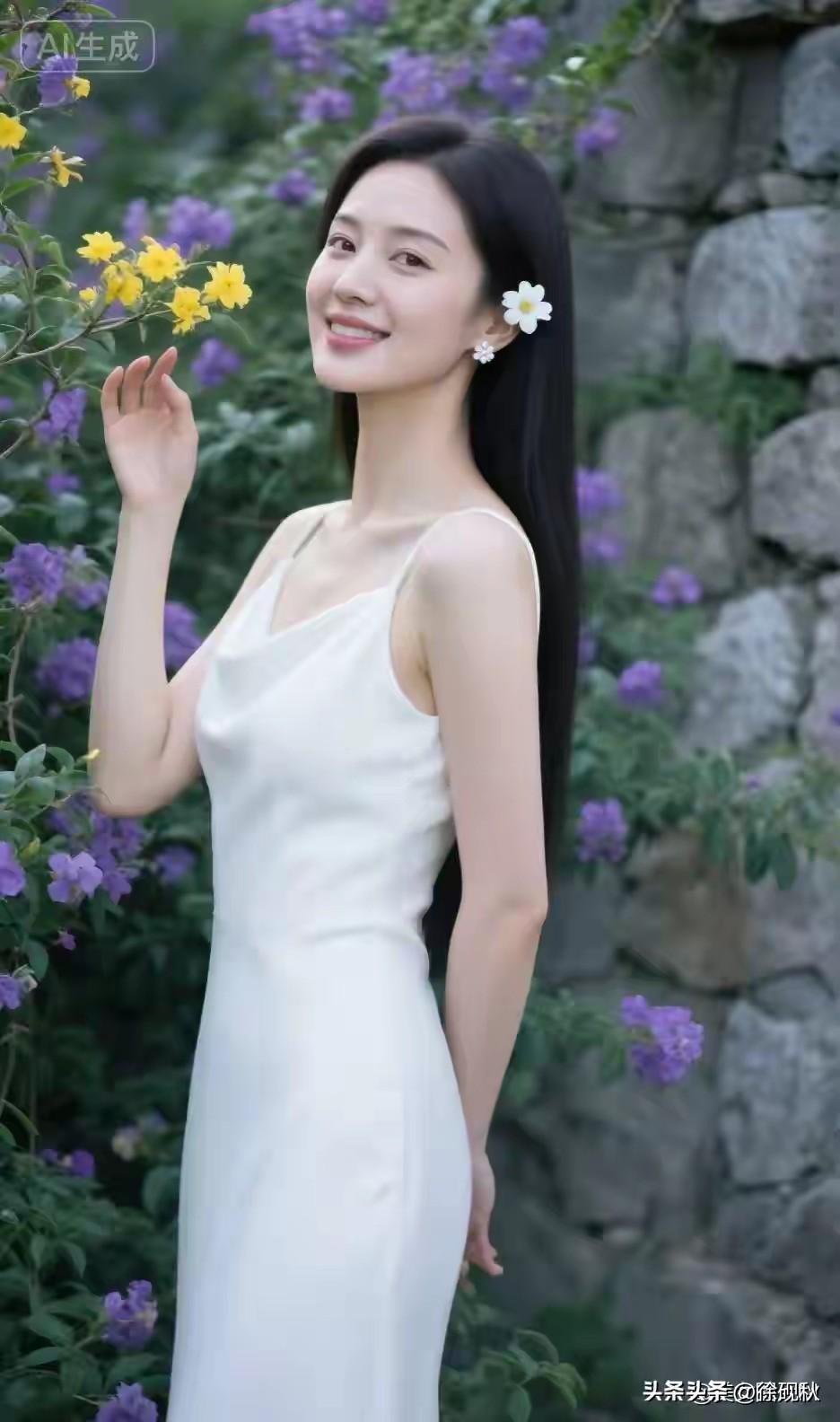 嫣然一笑百媚生, 吊带裙装显风情。 青丝如瀑随风舞。 眸若秋水映繁星。
