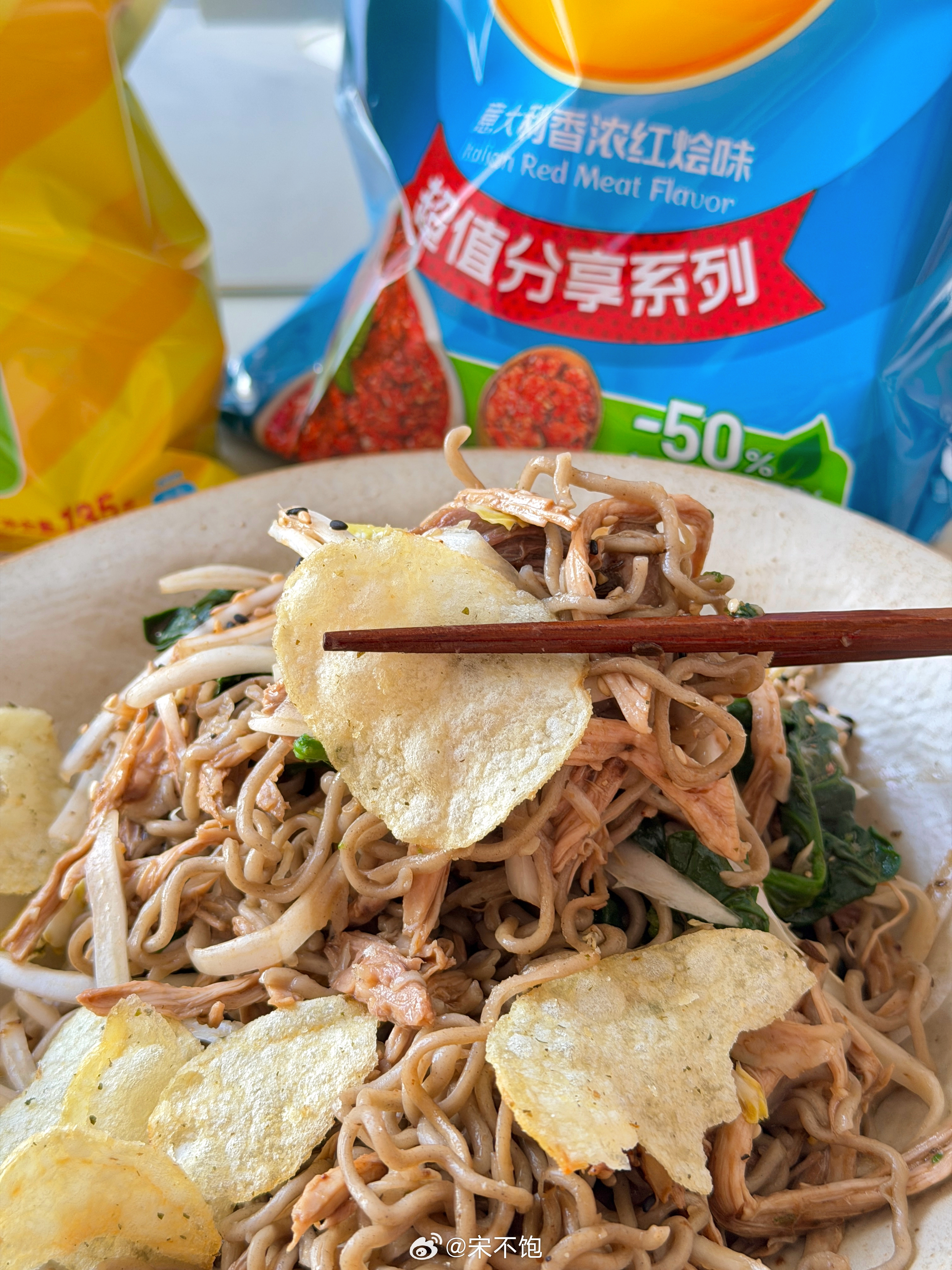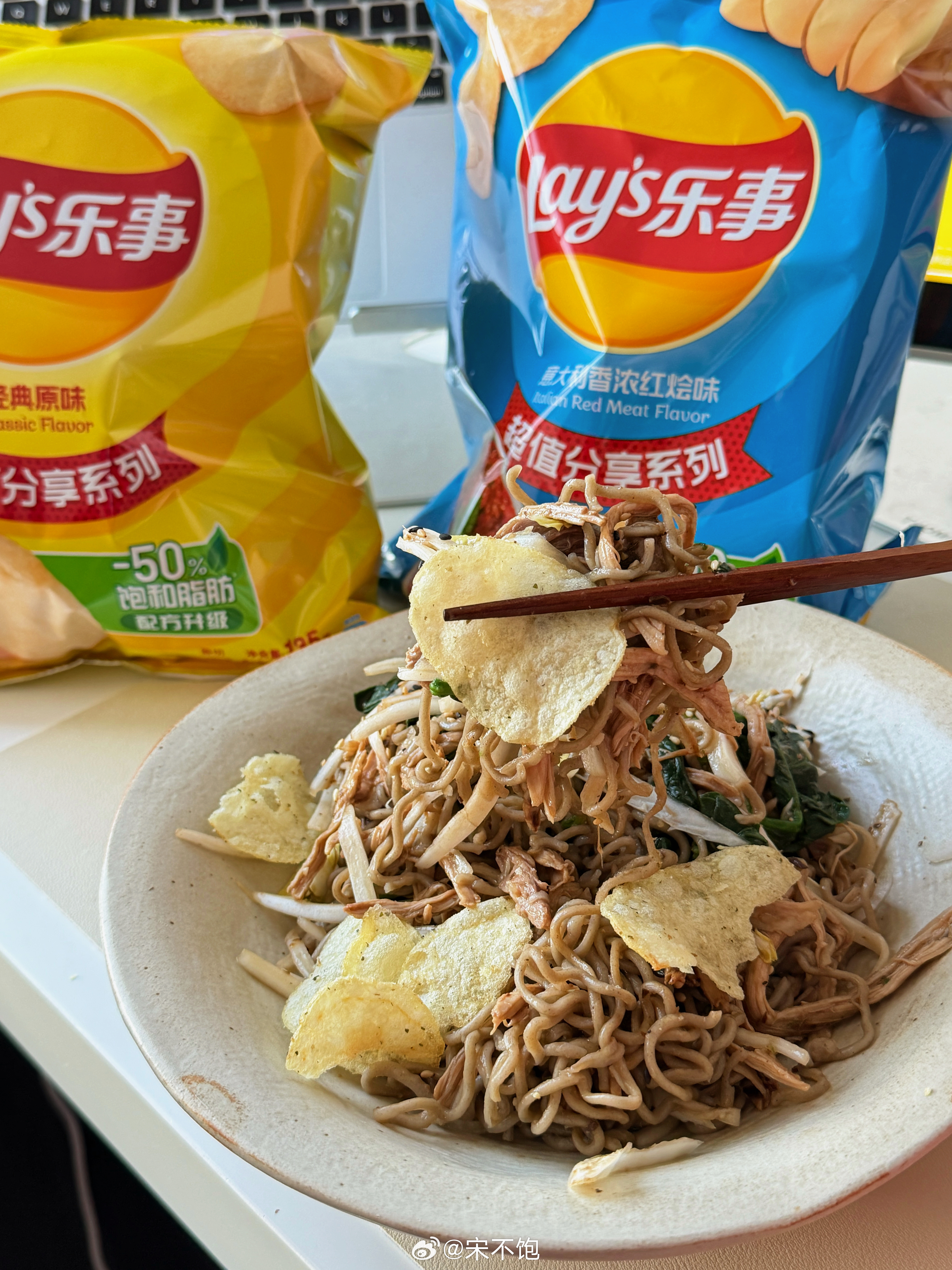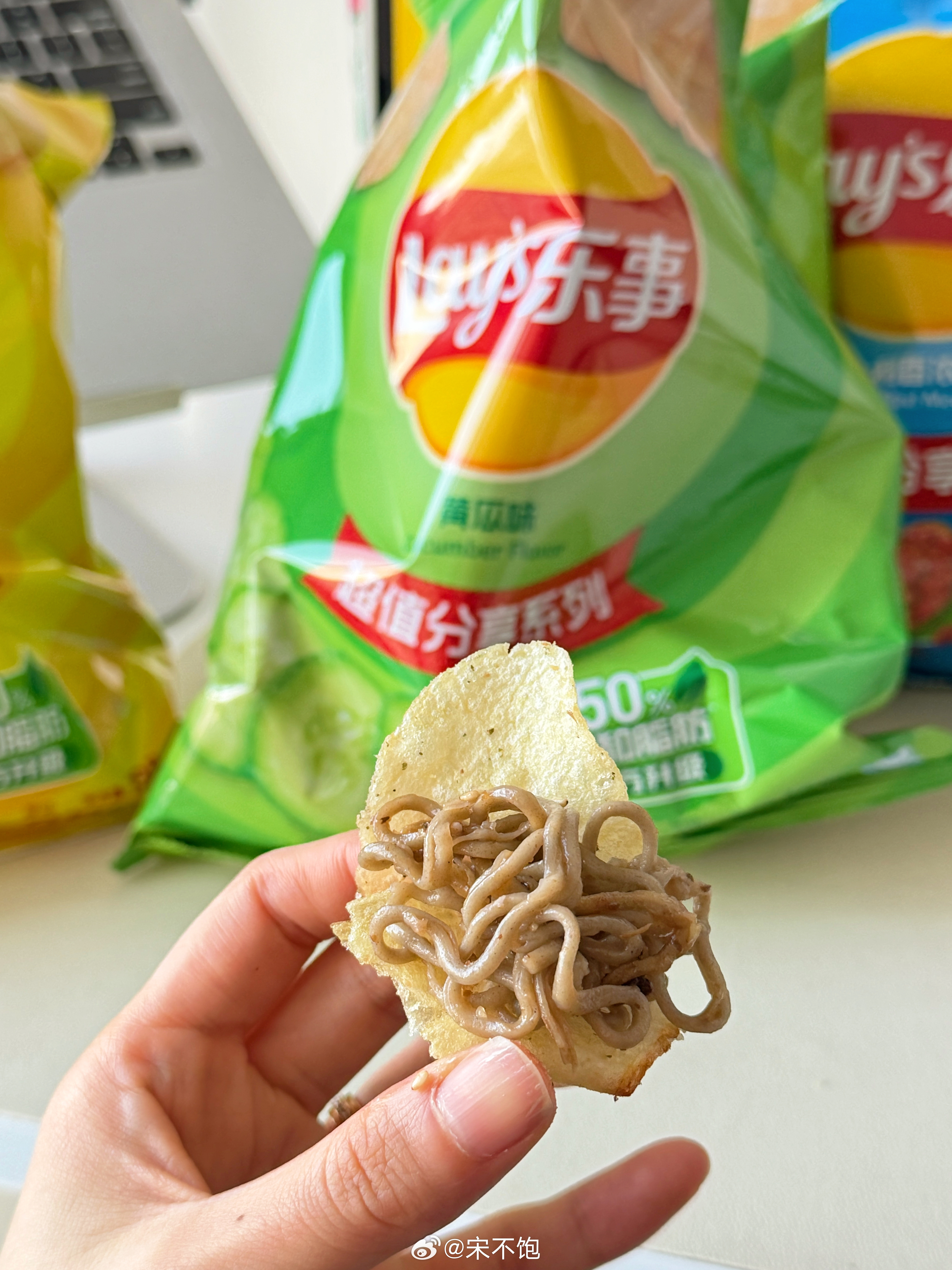 最近还开发了新吃法,这个黄瓜味的乐事拌面条也可好吃,不光提供了薄脆口感,还增加了黄瓜的清香,让面条更上一个level!原味是貂哥最爱,黄瓜是我和肉松最爱!想知道你们的最爱是哪款~~