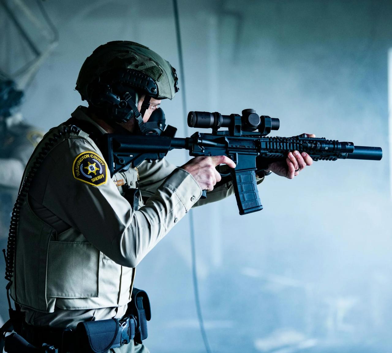 华盛顿县警官正在操作他的 Daniel Defense Mk18 5.56 毫米突击步枪,该步枪配有 DD RIS II 导轨、Vortex Razor HD de 1-10x24 光学瞄准镜、Surefire M300 灯、Surefire SOCOM Mini 抑制器和 B5 增强型 SOPMOD 枪托。