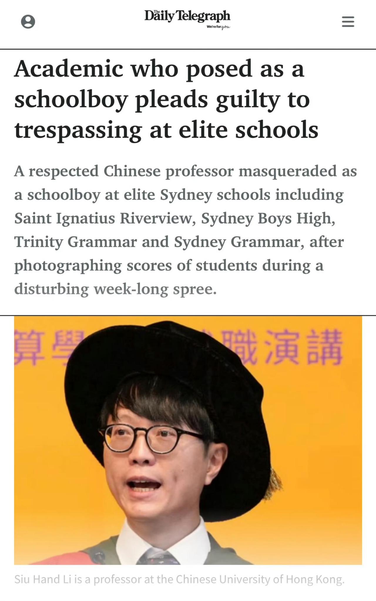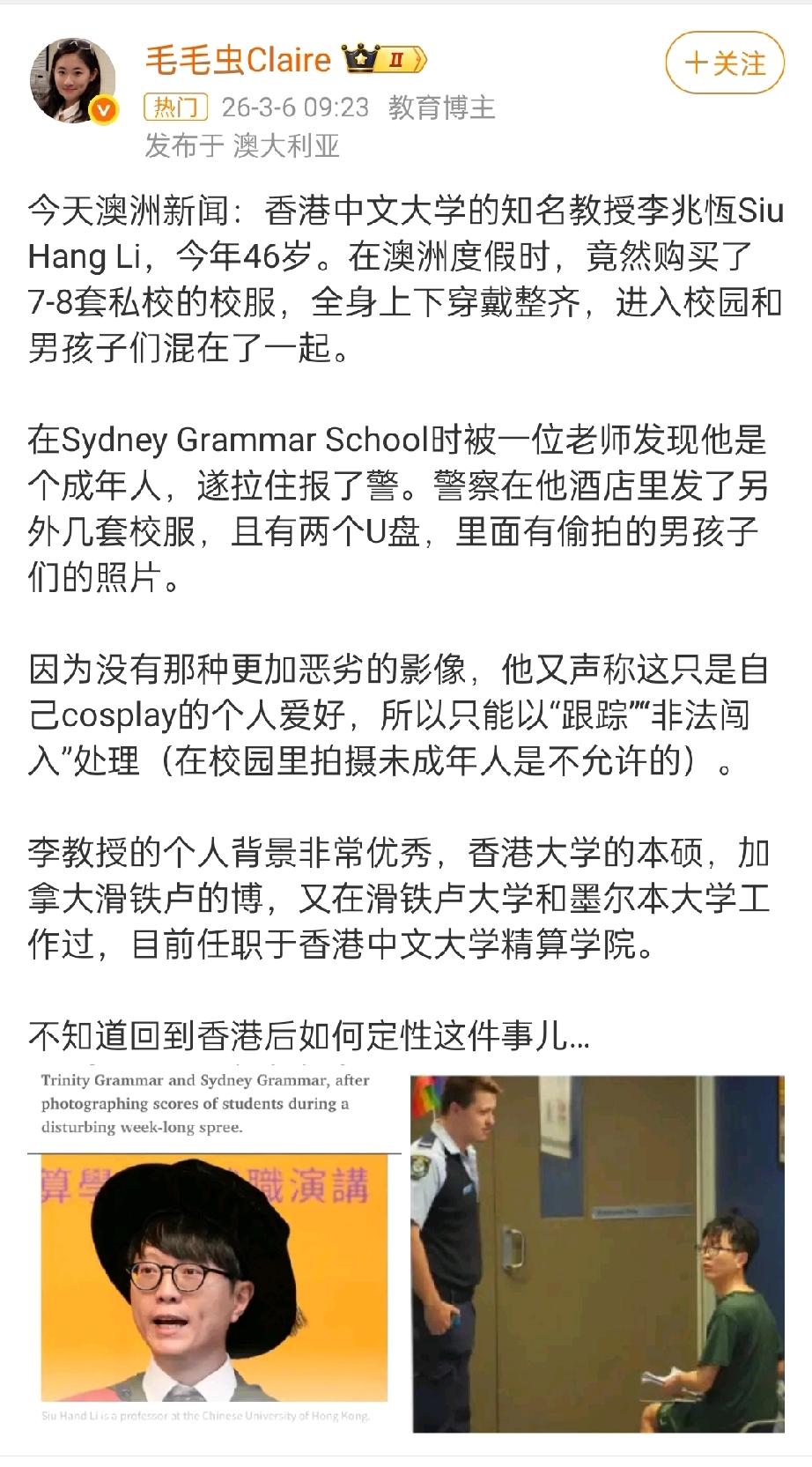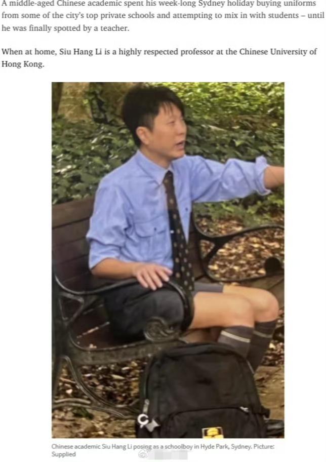 46岁华人教授穿校服装高中生,在澳大利亚悉尼海德公园附近偷拍学生被发现报警…一 46岁的香港某大学教授在悉尼度假,穿着校服混进学生堆里装高中生,还在偷拍了几十个学生的照片,最后在 Hyde Park 被一老师发现明显是成年人,直接报警。更魔幻的是 他2020年其实就干过类似的事…多少有点在身上 [皱眉][皱眉][皱眉]有经历过30岁失业的吗? 海外网评 海外条友说