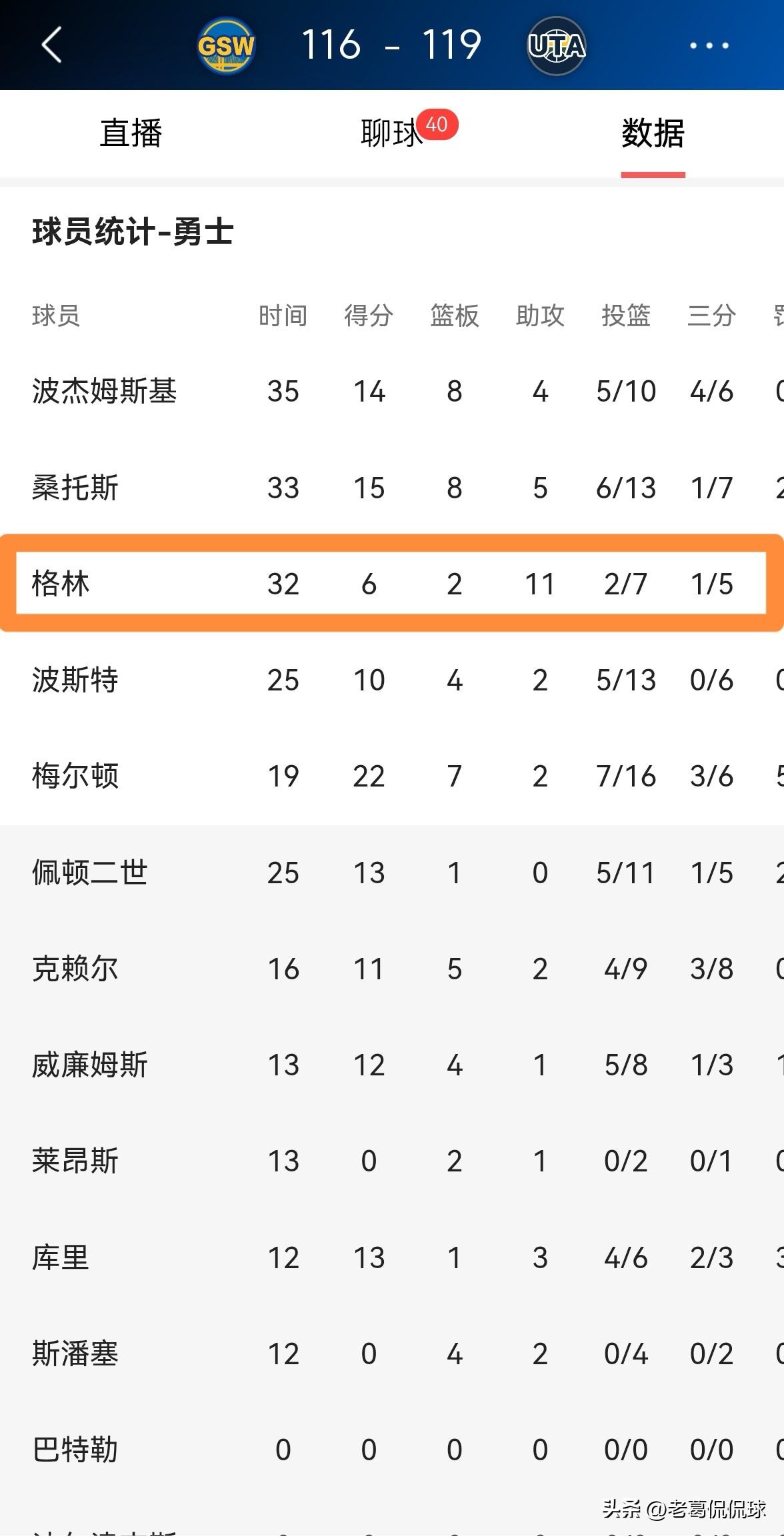 勇士老将追梦格林再一次打出了标志性的表现!在今天勇士客场以116:119不敌爵士的比赛中,追梦格林首发出战32分钟,投篮7中2,其中三分球5中1、罚球2中1得到6分2篮板11助攻,没有出现任何的失误,不过有4次犯规,他的场上正负值为-3。 说实话,本场比赛追梦格林的表现说不上好也说不上差,这是一场典型的追梦格林式表现。