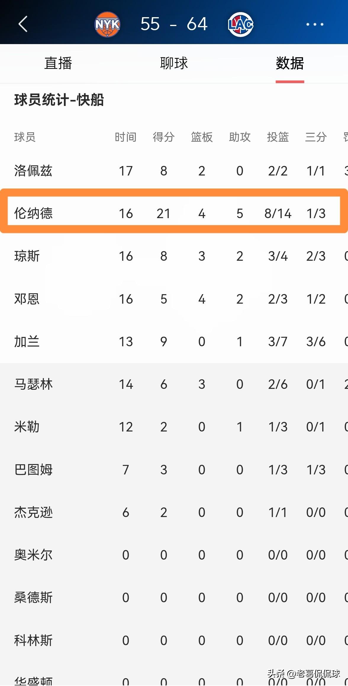 快船超级球星伦纳德真是强的吓人!在今天快船主场迎战尼克斯的焦点战中,目前双方半场战罢,快船凭借着伦纳德的精彩表现以64:55领先对手。 在前两节比赛中,伦纳德又一次杀疯了,他在首发出战的16分钟里,投篮14中8,其中三分球3中1、罚球4中4爆砍21分,外加4篮板5助攻1抢断,他的场上正负值为+13。 坦白说,以伦纳德在上半场比赛中的出色状态来看,本场比赛伦纳德不砍下40分就对不起他的火热手感。