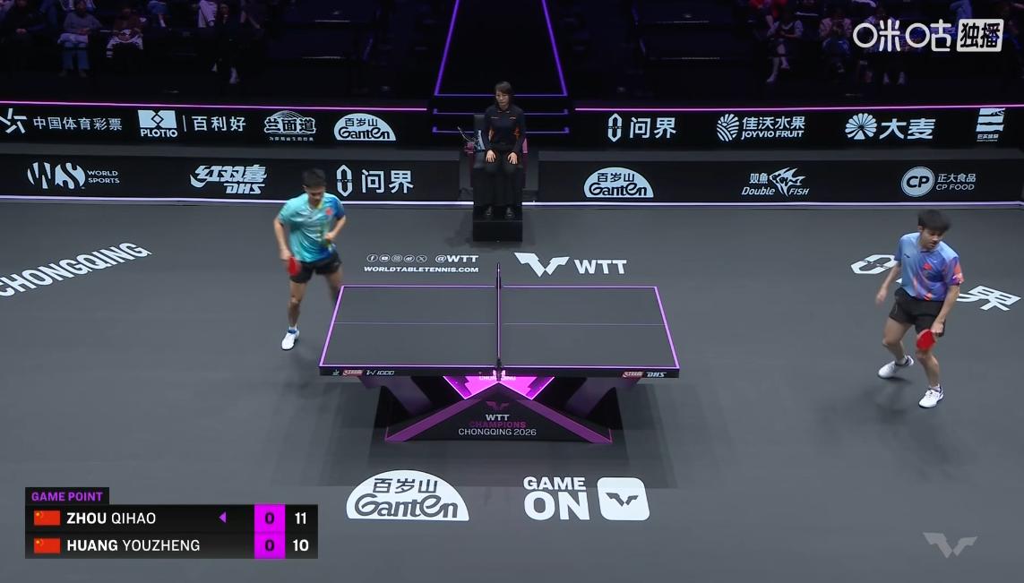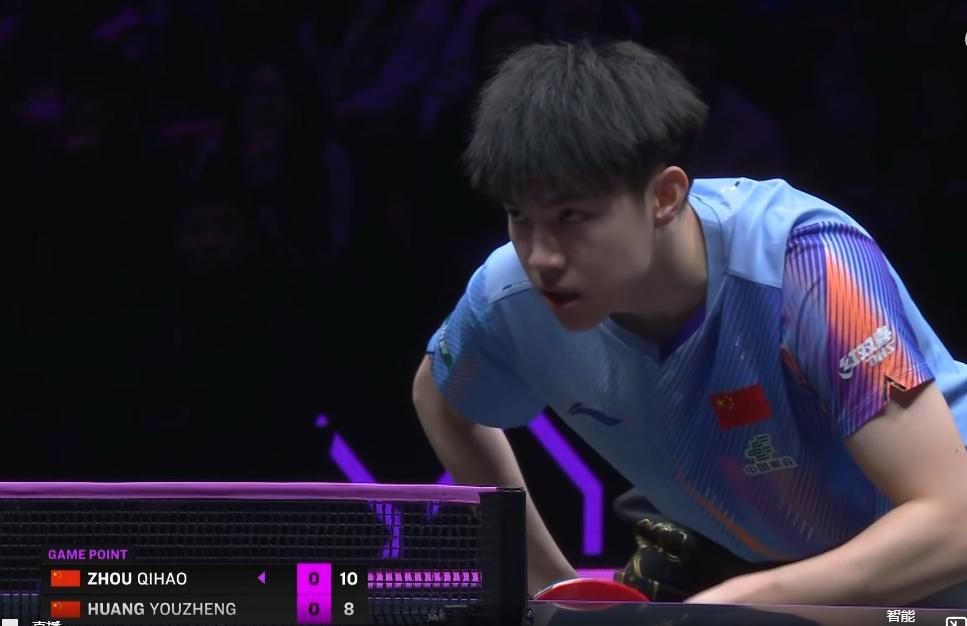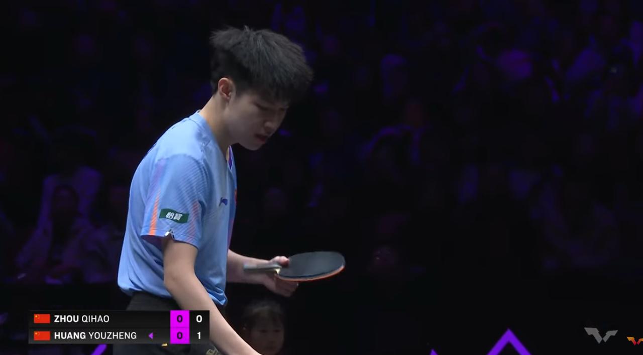 黄友政还是太年轻了, 面对周启豪开局打的有点束手束脚, 5:1启豪取得领先, 黄友政依靠反手搏杀, 将比分追至6:5, 双方也慢慢适应了比赛节奏, 启豪连续发抢得分, 9:6将比分扩大, 黄友政拧拉失误, 10:6,启豪率先拿到局点, 黄友政竟然了一波4:0, 将比分追成10:10, 今天周启豪的发球不好, 没有太多变化,正手短,反手长, 关键时刻周启豪顶住压力, 连得2分, 12:10,周启豪先下一城