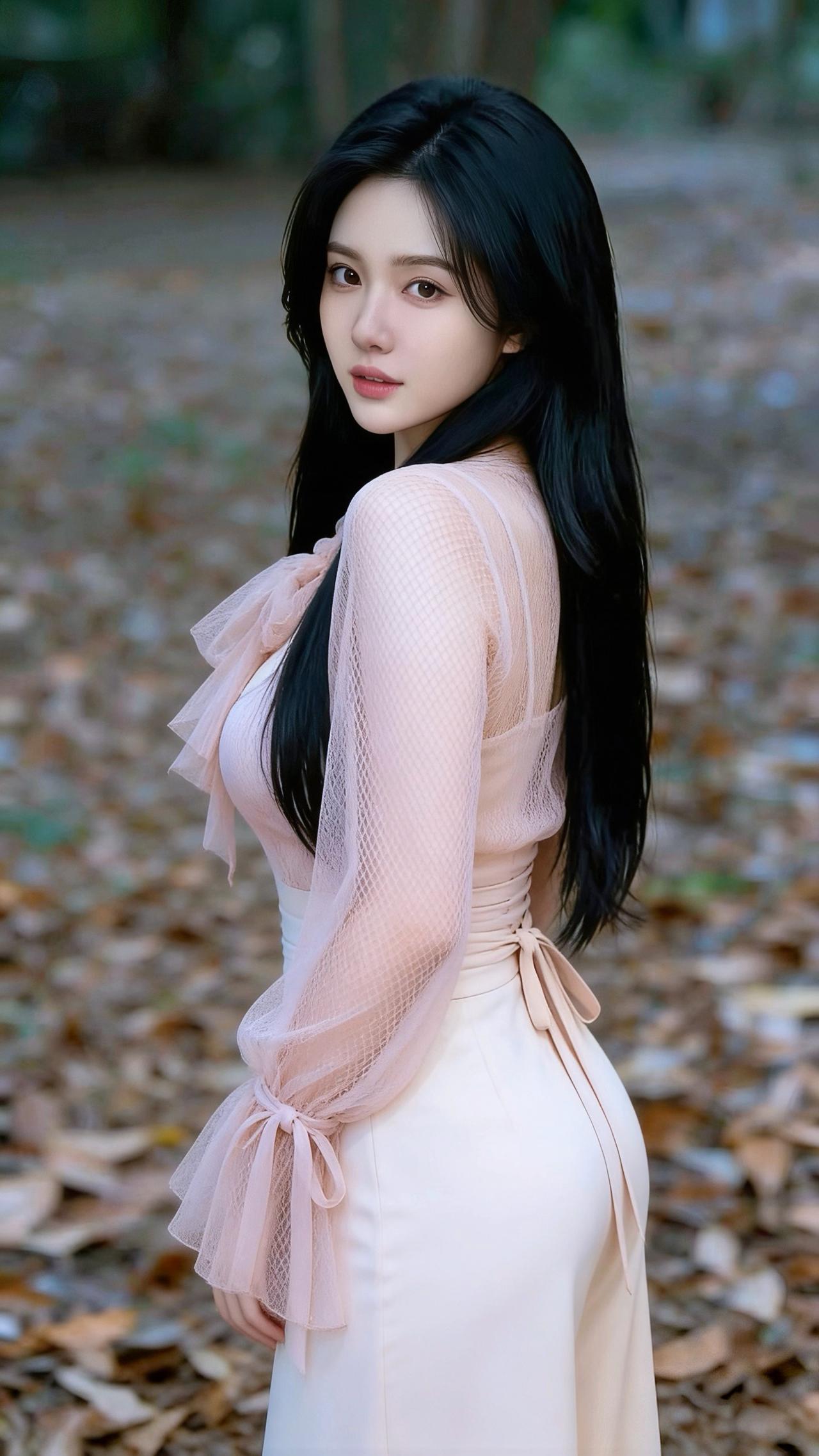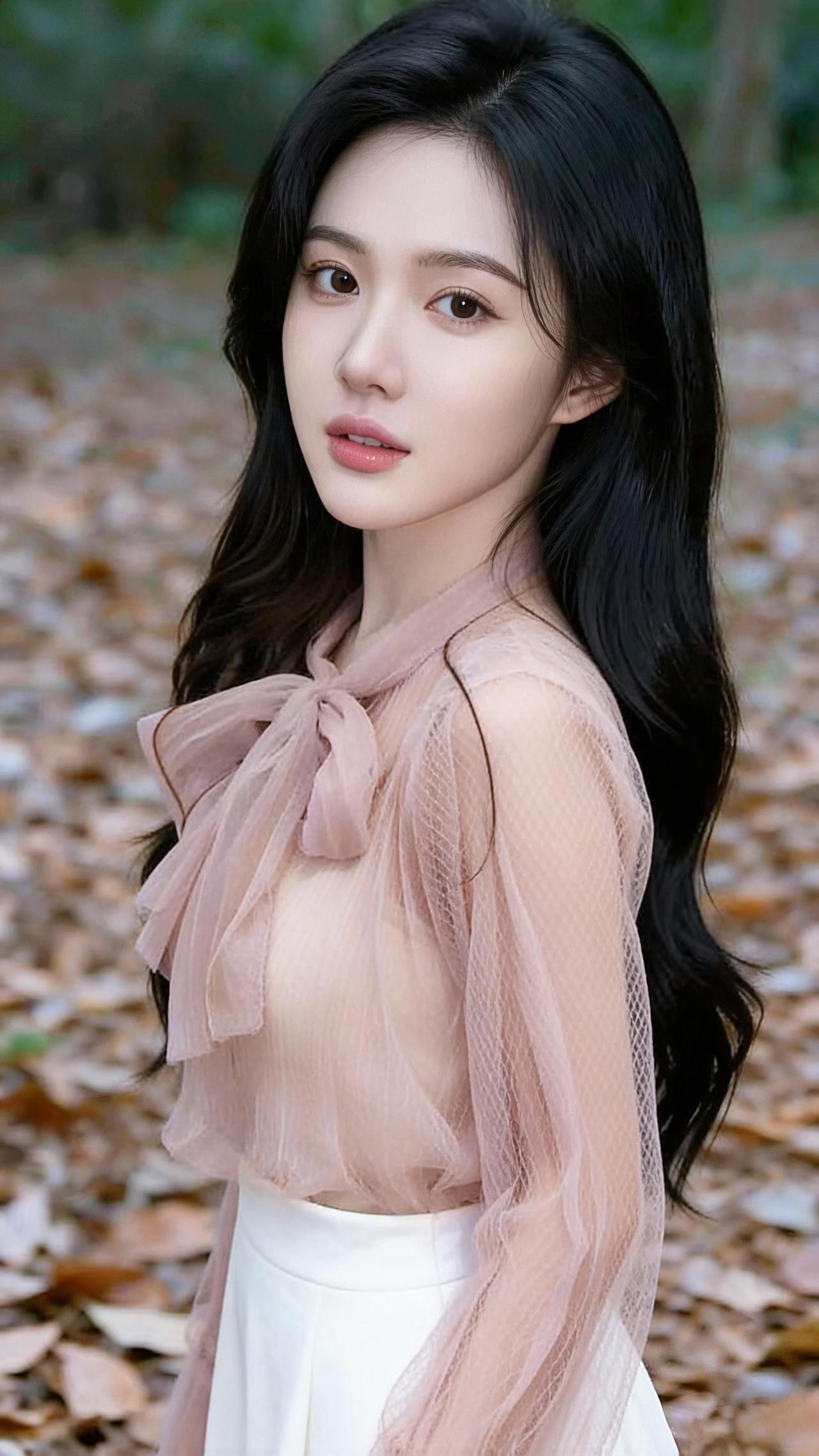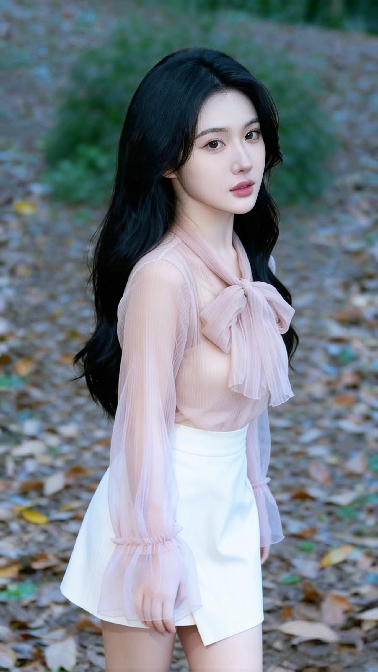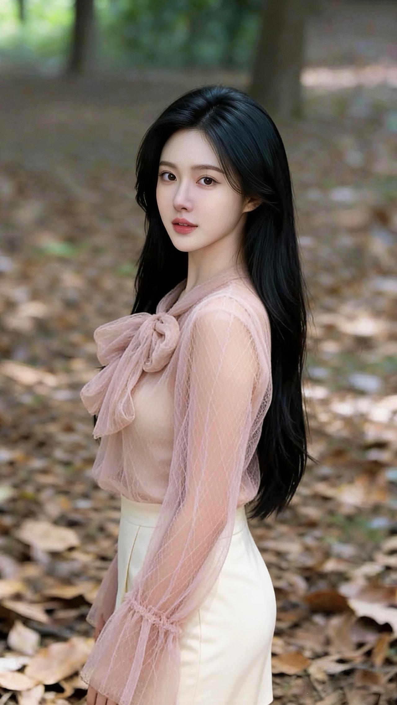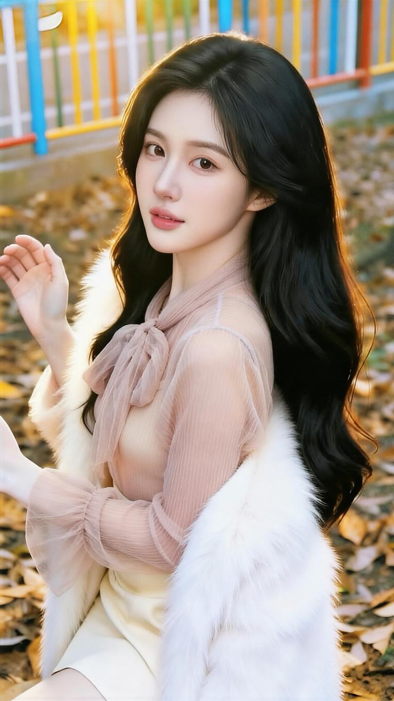 她偏爱温柔的网纱上衣,浅粉色款带着精致的蝴蝶结领和喇叭袖,朦胧的网纱材质透着轻盈仙气,搭配米白或奶白色下装,温婉又甜美;黑色款则更显优雅干练,配上格纹半裙,多了几分知性成熟。偶尔披上白色毛绒外套,又添了几分温柔贵气。 背景是铺满落叶的林间或色彩明快的栏杆旁,秋日氛围里,她的一颦一笑都带着治愈感,既有少女的清甜,又有成熟女性的优雅韵味,整体气质干净又温柔,像秋日里的一缕暖阳,让人觉得格外舒服。