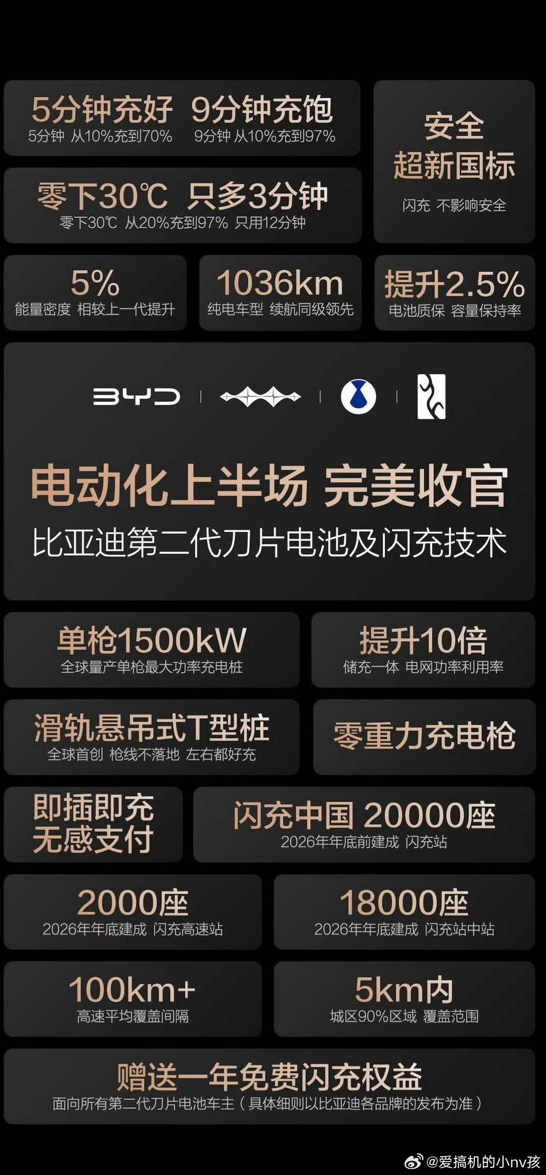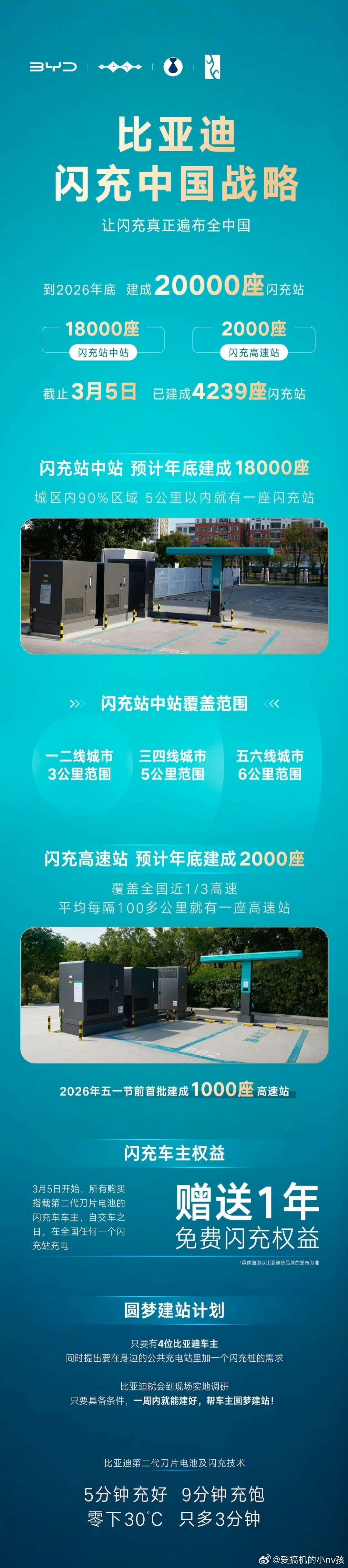 搭配第二代刀片电池,充电速度快到离谱:常温5分钟充好、9分钟充饱,零下30度也只多等3分钟 。新充电桩设计超贴心,枪线悬空不拖地,取放轻盈,左右充电口都能轻松够到,即插即充、无感支付,全程不用掏手机。而且“闪充中国”的覆盖速度更惊人!今年底全国要建成20000座闪充站,五一前先落地1000座高速站,城区5公里内、高速每100多公里就有站。每根桩都带储能系统,多车同充也不掉功率,还不添电网负担。车主首年免费充,后续不加价;4人联名还能参与“圆梦建站”。速度、覆盖、体验拉满,这才是中国闪充的硬实力!
