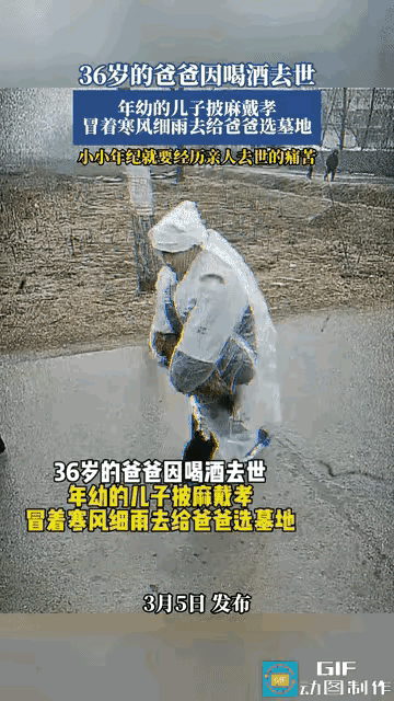 网友心酸了:36岁的爸爸因喝酒去世,年幼的儿子披麻戴孝冒着寒风细雨去给爸爸选墓地。手里抱着大公鸡,腰都直不起来了,小小年纪就要经历亲人去世的痛,看的让人心酸! 冷风裹着细雨往骨头缝里钻,孩子身上的孝衣被风吹得鼓鼓的,怀里紧紧抱着那只用来引路的大公鸡,小小的身子弯得像棵被霜打了的苗。他走得很慢,每一步都踩在湿漉漉的泥地里,鞋子早就湿透了,却没人顾得上给他擦一擦。周围都是忙着办事的大人,没人真正蹲下来,好好问问这个孩子心里怕不怕、疼不疼。 才几岁的年纪,别的小朋友还在爸爸怀里撒娇,要糖吃、要抱抱,他却要学着大人的样子,披麻戴孝,送爸爸最后一程。那只大公鸡在怀里不安地扑腾,他只能用更小的力气抱紧,仿佛那是他和爸爸之间,最后一点能抓住的联系。雨水打在他的脸上,分不清是雨还是泪,他不哭不闹,只是安安静静地跟着大人走,这份懂事,反而比大哭大闹更让人揪心。 36岁,正是一个男人最该扛事的年纪,上有老,下有小,却因为喝酒,匆匆离开了人世。很多人看到这一幕,只会说一句“太可怜了”,可很少有人往深里想,这场悲剧,原本是可以避免的。 酒桌文化、人情往来、面子应酬,多少人把喝酒当成了不得不做的事。明明身体已经不舒服了,明明家人一再叮嘱少喝点,却因为一句“不喝不给面子”,一杯接一杯往下灌。大家总觉得,少喝一点没事,偶尔一次没关系,可生命从来不给人后悔的机会。一次放纵,一场意外,就足以毁掉一个完整的家。 爸爸走了,最苦的就是这个孩子。他还没来得及好好长大,还没来得及记住爸爸更多的样子,就要永远失去依靠。以后放学,没人接他;受了委屈,没人护着;想要爸爸的时候,只能对着一张照片说话。他这辈子的成长里,父亲这两个字,永远是空缺的。 我们总在说要珍惜家人,要爱惜身体,可真正放在自己身上,很多人都不当一回事。以为年轻就能随便造,以为意外不会落在自己头上。可现实就是这么残酷,一个人的不负责任,最后要一整个家庭来买单,最无辜的,就是那个还什么都不懂的孩子。 寒风还在吹,细雨还在下,那个小小的身影,会在很多人的心里留下很久。这不是一个遥远的故事,这是在提醒我们每一个人:好好活着,不是为了自己,更是为了那些仰仗着我们、爱着我们的家人。别等失去了,才明白什么最重要。 各位读者你们怎么看?欢迎在评论区讨论。