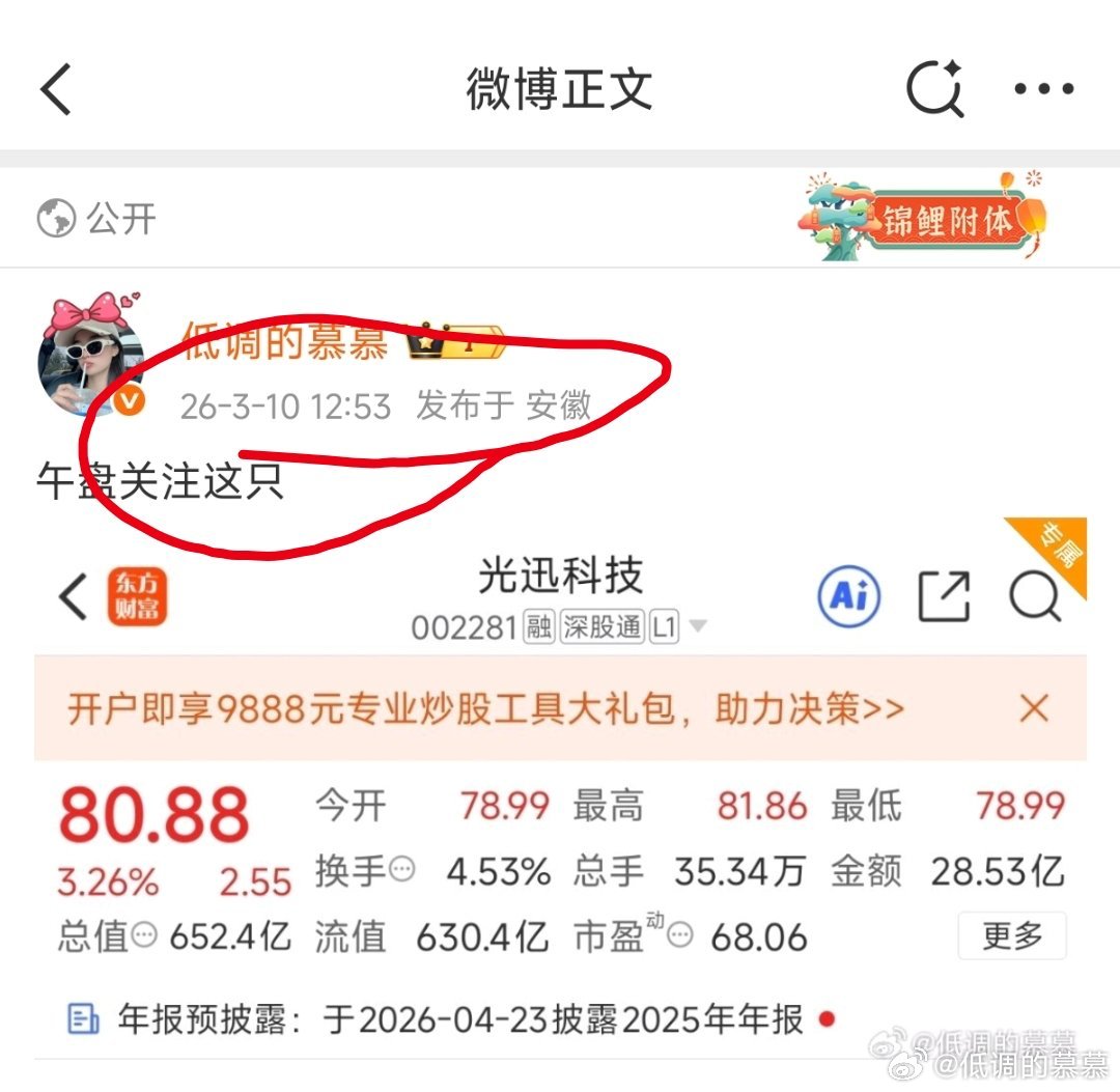 午盘前分享给大家的V+小票$光迅科技 sz002281$ ,午后直线涨停,牛不牛