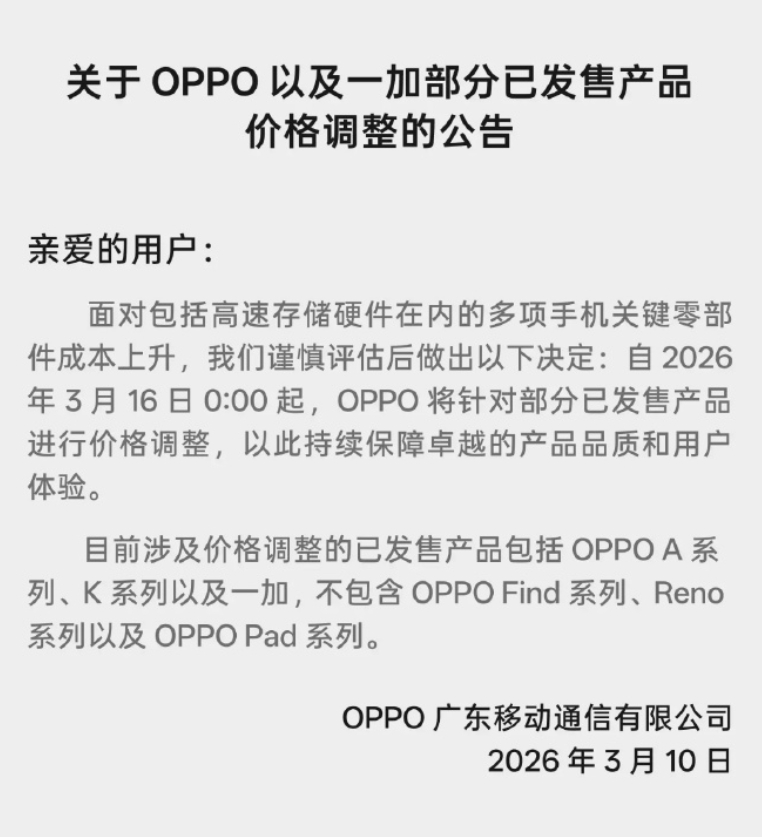 手机市场将迎来全面涨价 手机涨价潮真的来了!OPPO 官宣 3.16 起部分产品调价,多家主流厂商也都喊出涨价压力,核心就是 Q1 全球内存价格飙涨 80%-90%,而这波涨价根本不是短期波动,是真的要持续很久了!起码今年年底无望了,最快也要27年的一季度差不多,千元机今年应该彻底没了,绝对卖一台亏一台。