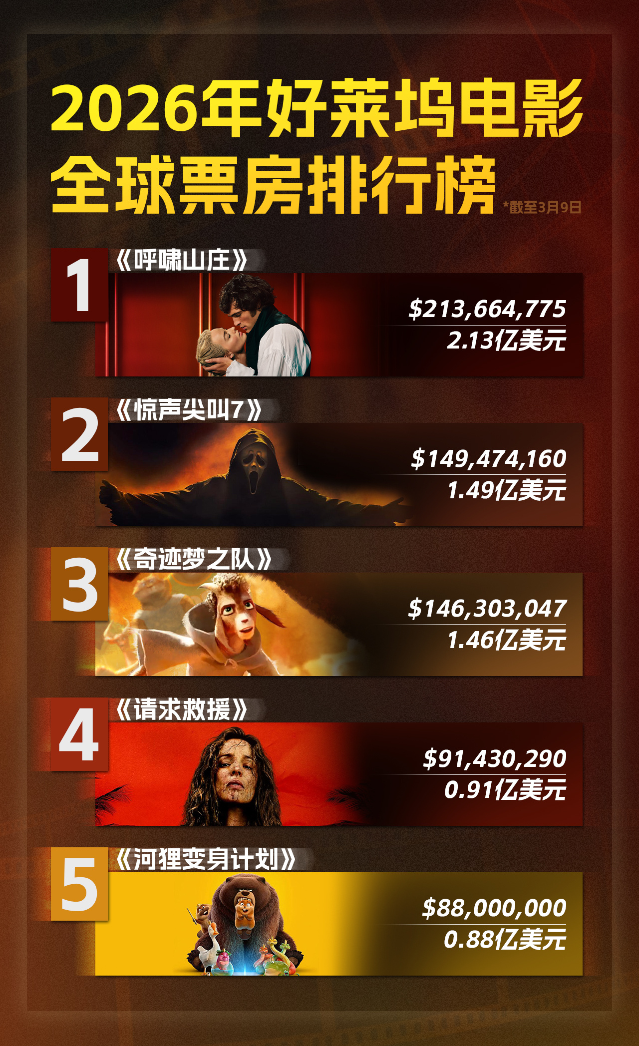呼啸山庄2026好莱坞电影全球票房冠军 恨海情天鼻祖《呼啸山庄》的含金量还是在的,海外票房突破2亿美元,截至目前还是2026年好莱坞电影全球票房冠军看了很多海外的影评,很多人痛哭,表示会三刷和四刷!不过我还挺期待这部电影的,芬内尔导演对画面的把控很戳中我的审美,特别是冷暖色调的极致对比,在电影院看肯定很享受,凯茜和希斯克利夫疯狂的爱与恨也十分带感啊,两人真就是对彼此深深迷恋,深深沉醉,深深纠缠,很上头!电影呼啸山庄 火热预售中,3.13上映,速速买票去看仙品虐恋!