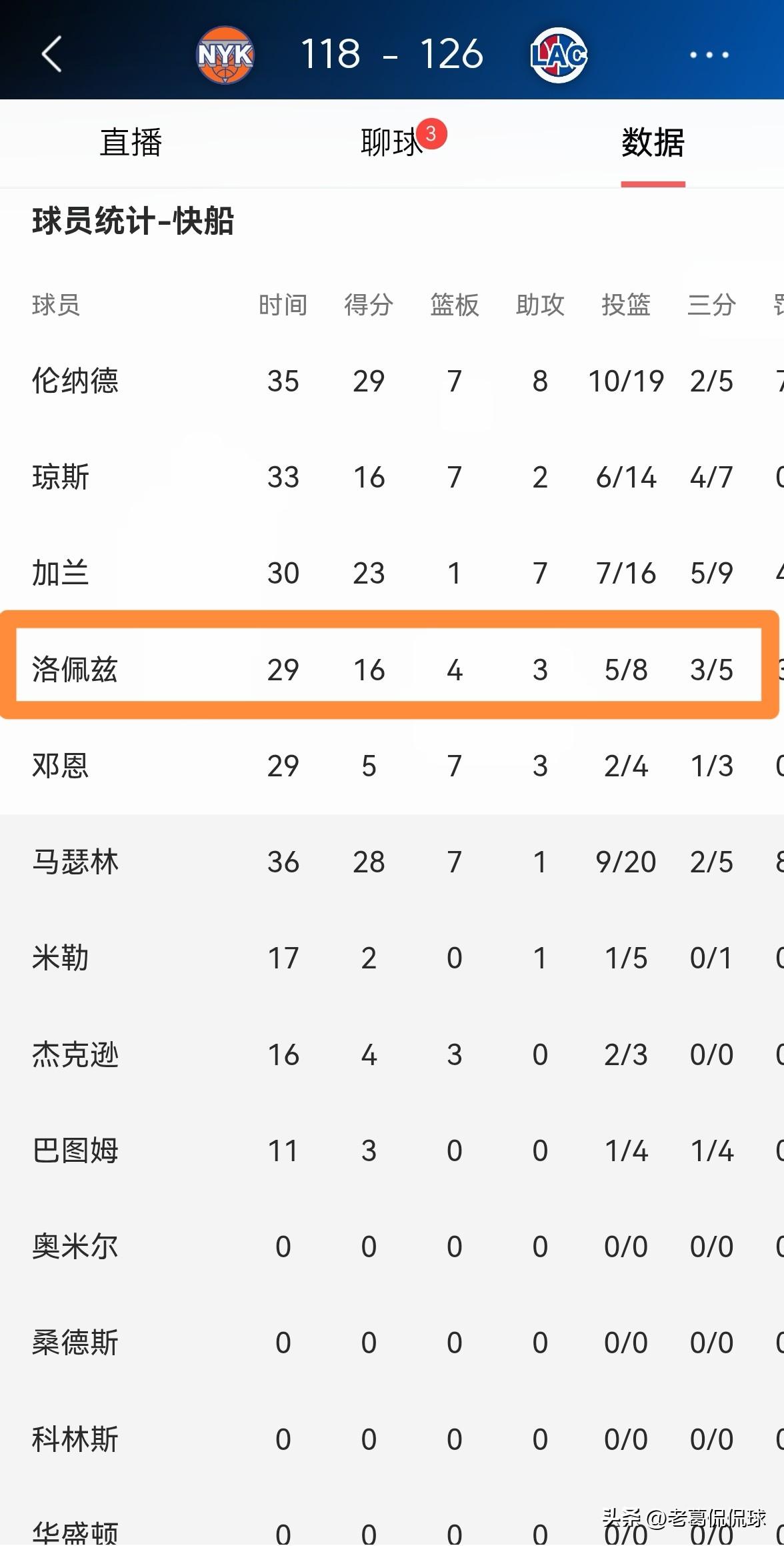 快船老将洛佩兹真是让人赞不绝口!在今天快船主场以126:118战胜尼克斯的比赛中,37岁的洛佩兹在攻防两端都打出了可圈可点的表现,他在首发出战的29分钟里,投篮8中5,其中三分球5中3、罚球3中3非常高效的砍下16分,还有4篮板3助攻1盖帽,他的场上正负值为+23。 值得一提的是,洛佩兹和伦纳德的默契度真是越来越好了,当伦纳德遭遇包夹防守时,洛佩兹就会及时的出现在自己的投篮点,然后稳稳地命中空位三分。