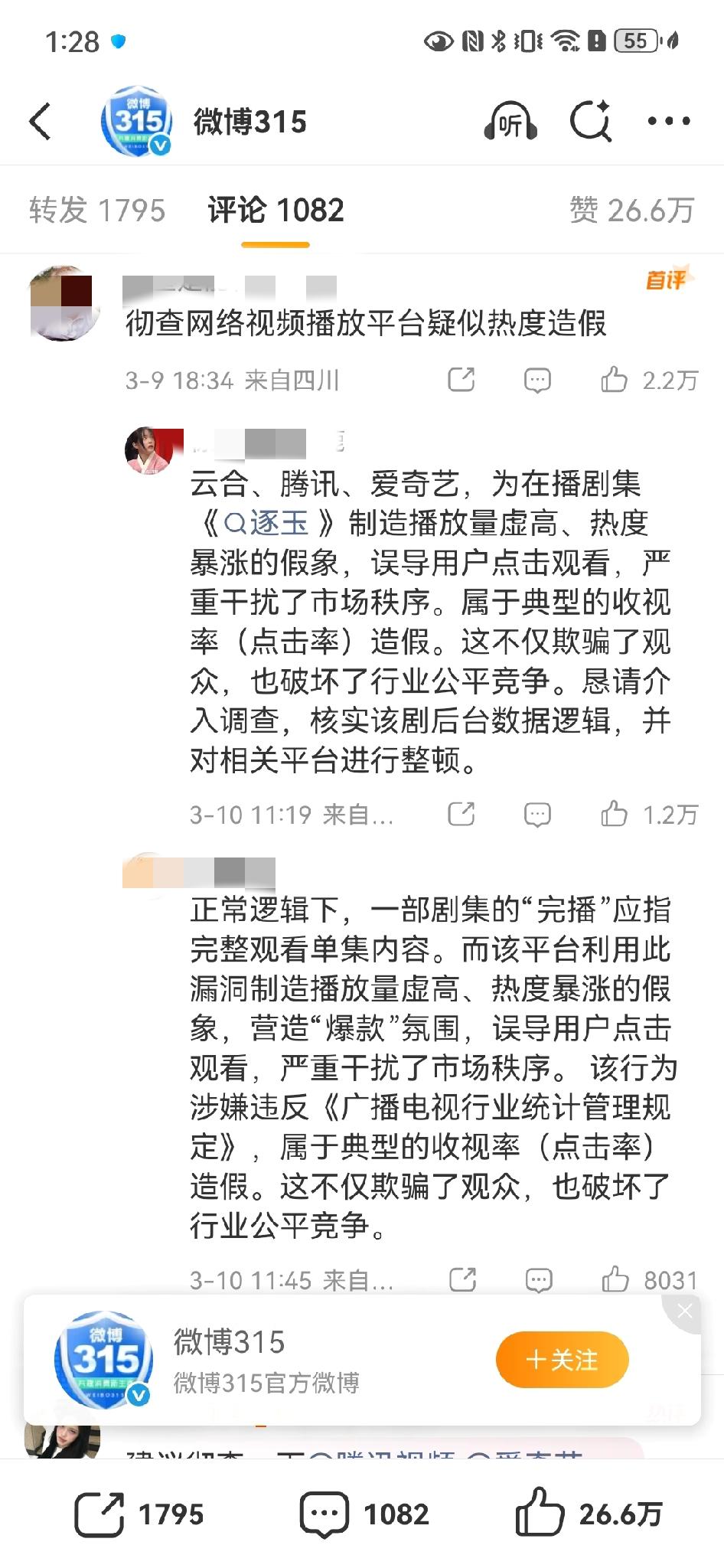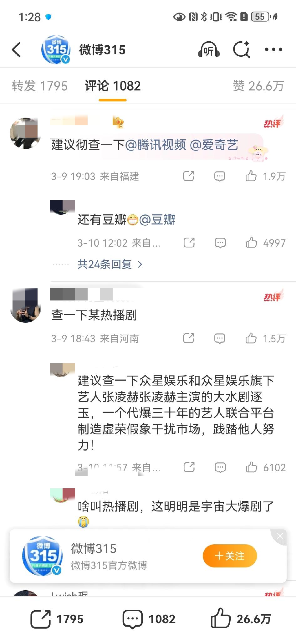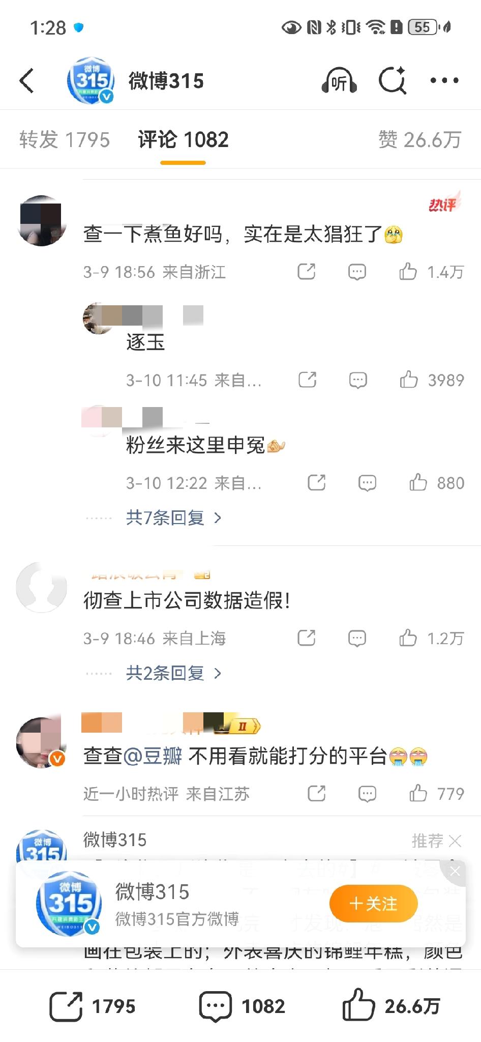 315官号评论区,网友要求彻查🪿、🥝、豆瓣、逐玉数据造假![笑哭]