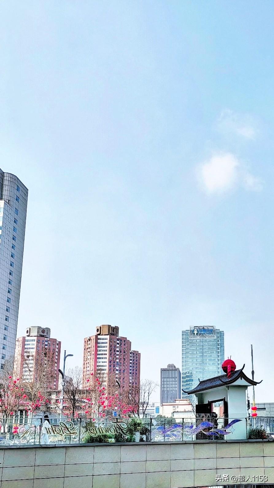 今天的天气不错, 天气晴朗温度适宜。 随手拍下了蓝天下, 中山路与高楼相映的美
