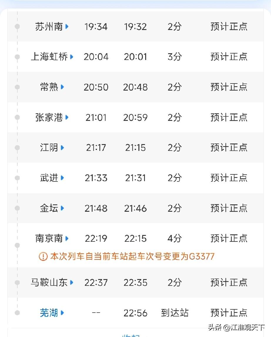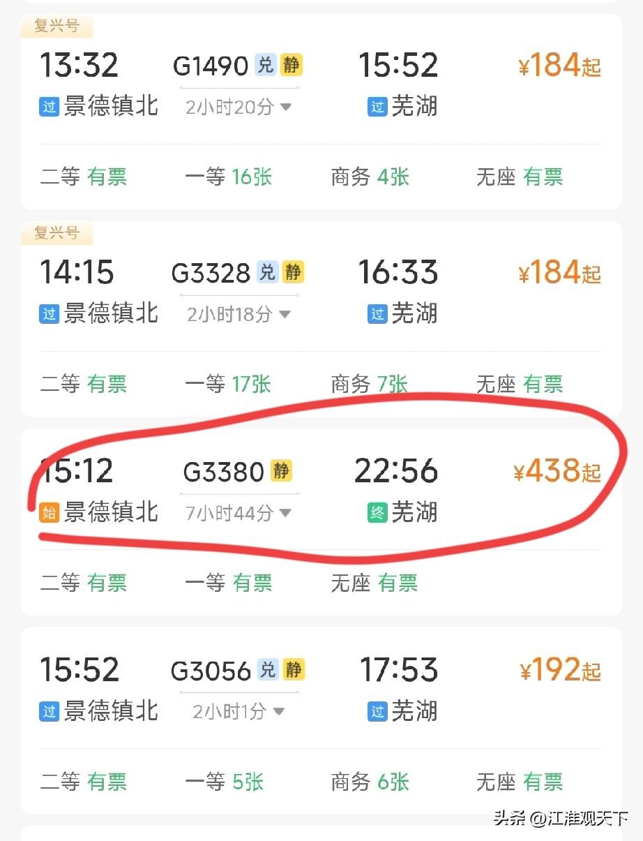 皖赣两省之间有一班高铁g3380次,要绕行6条线路,站站乐排班 安徽省与江西省两省交界,也是邻居省,安徽省会合肥市到江西省会南昌市,最快高铁只需要2个小时20分钟,非常方便。 今年1月份铁路调图后,两省之间有一班高铁车次,却是运营时间长达近8个小时,那就是上海铁路局南京客运段承运的G3380次,由景德镇北站开往芜湖站,全程运营时间7小时44分,二等座票价438元,对比景德镇到芜湖的其他高铁车次,用时都在2小时左右,票价只要184-192元,这班列车可谓是时间长,票价贵。 看看g3380次高铁经过的线路就知道为什么这么远,这么贵了?全程需要途径衢九线,杭衢线,合杭线,沪苏湖线,沪宁线,宁安线等6条线路,下午3点12分从江西景德镇北站出发,经过浙江,上海,江苏,最后晚上10点56分,才能到达安徽芜湖火车站,途经华东地区的4省1市,绕了一个大半圈。 g3380次的开行,并不是主要承运景德镇到芜湖的直达旅客,主要就是为了沿线短途旅客的出行方便,总共停靠江西,浙江,上海,江苏,安徽的21个车站,就是站站乐排班。江西动车 长三角加开列车 江浙沪高铁