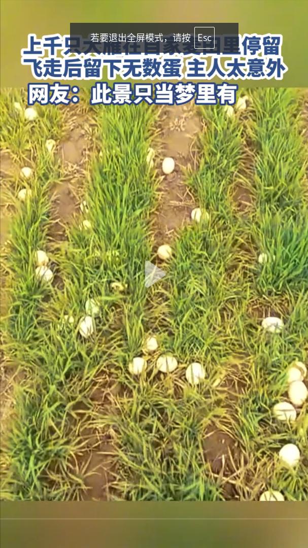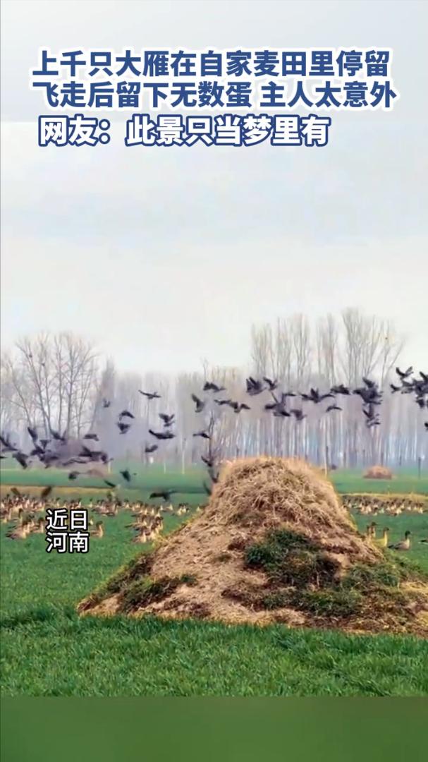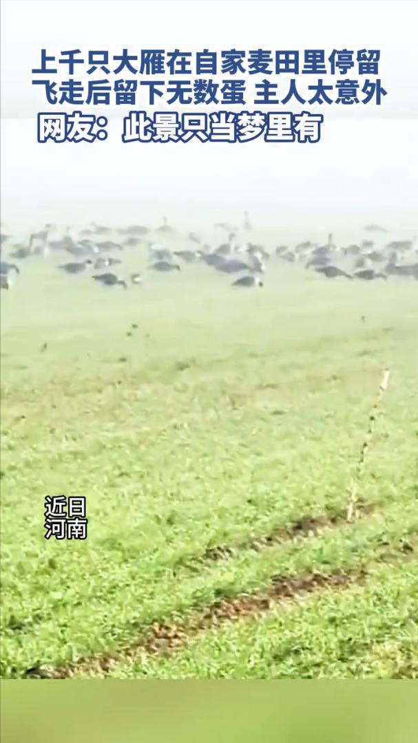 河南,千只大雁迁徙途中在麦田里停留,飞走后给地主人留下无数蛋! 清晨的豫东平原,薄雾还没散透。男子到自家麦田里查看小麦的长势。 可也却看见麦田里黑压压的全是鸟,足有上千只,显然这群鸟把麦田当成了服务区,吃吃喝喝,歇脚聊天,有几对甚至在麦垄里谈起了恋爱。把刚返青的麦苗踩得东倒西歪。 男子也是第一次看见有这么多这么大的鸟聚集在一起,男子掏出手机想拍下视频。 大鸟见有人来了,有几只突然腾空而起,可眼前的一幕把男子给惊到了,好家伙,麦垄里全是蛋。 后来男子一查这群鸟原来是大雁,而它们在麦地里留下的蛋足有上百枚。 男子将视频发到了网上,也引发了网友好奇和热议,有的网友说,不可能的事。大雁不是家里养的大鹅什么时候都下蛋,只有在繁殖季节才下蛋生小雁,不可能随时下蛋。 也有的网友说,这是保护蛋吗?要不要上交国家?国家二级保护动物下的蛋,算不算二级蛋? 还有的说,在你麦田可能吃麦苗,过意不去又下蛋给你顶报酬了! 大千世界无奇不有,这群大雁估计也是被这多变的天气给弄迷茫了,估计还以为到了目的地了,可不曾想把蛋留在了半途。 希望男子把这批雁蛋上交给国家,孵化出小雁,放飞大自然。