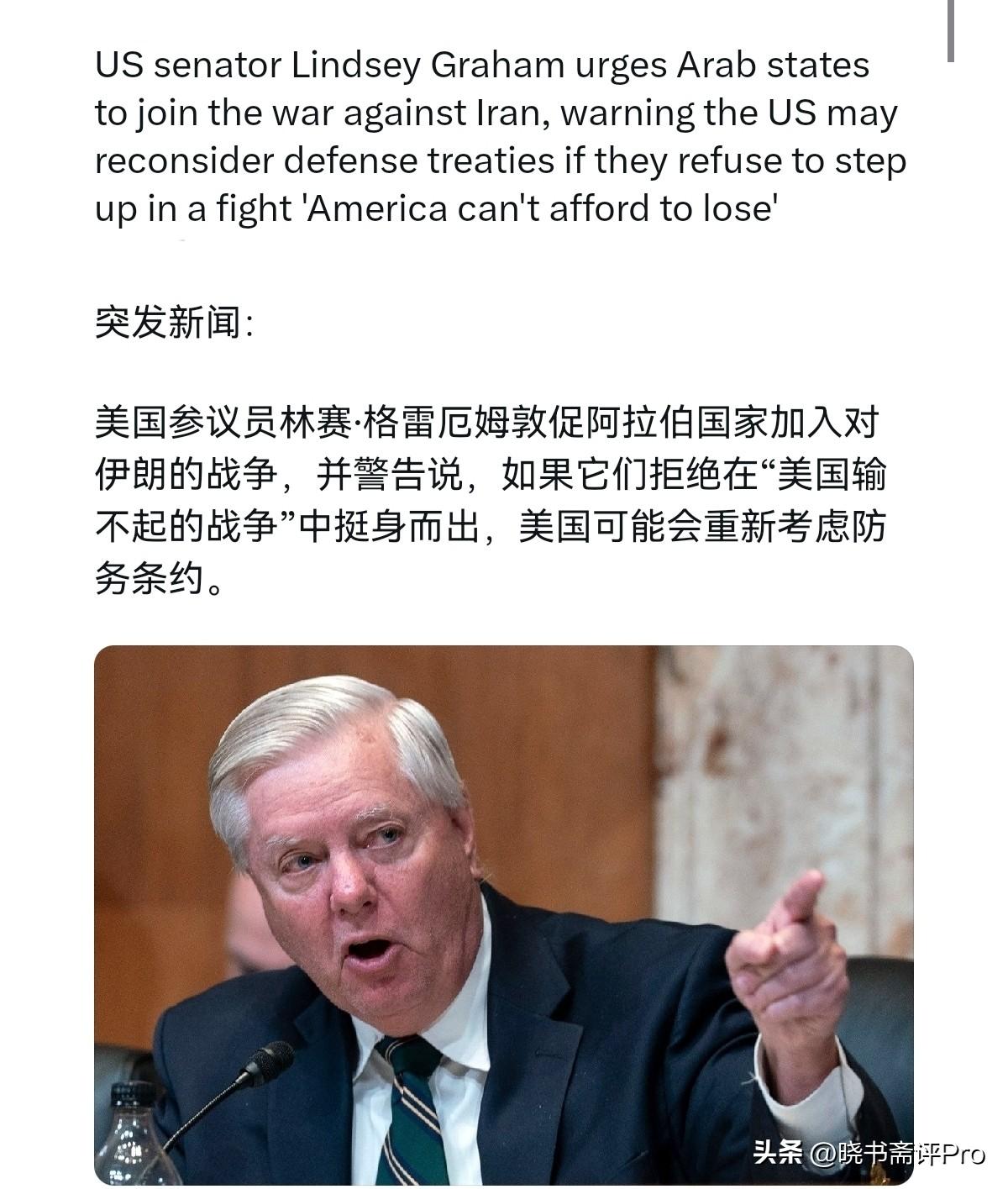 美国开始逼着阿拉伯国家上战场了!3月10日,美国美国参议员林赛·格雷厄姆敦促阿拉伯国家加入对伊朗的战争。此人警告称,如果他们拒绝加入一场美国输不起的战斗,美国可能会重新考虑防务条约。而相关信息显示,在美国发动对伊朗打击之前,此人曾经极力游说特朗普,是让特朗普拍板对伊朗动手的关键人物。 很显然,格雷厄姆的这一番话说明什么呢?这说明美国要实现目标越发不可能了,美国这是逼着阿拉伯国家上战场,给美国分担压力。当然,让人感到非常奇怪的是,按理说,跟美国关系最紧密的是北约盟友,美国不鼓动北约盟友参战,而是施压阿拉伯国家,则无疑非常的蹊跷。 当然,卡塔尔前总理哈马德·本·贾西姆认为,与其说美国是鼓动阿拉伯国家参战,毋宁说,美国正策划让伊斯兰国家互相厮杀。因为,只要阿拉伯国家参战,美国就将从冲突中撤出,并开始向双方出售武器。美国回归到拱火者和军火贩子的角色,坐收渔利。显然,美国的逼迫,是一条毒计,估计阿拉伯国家并不会上美国的当。