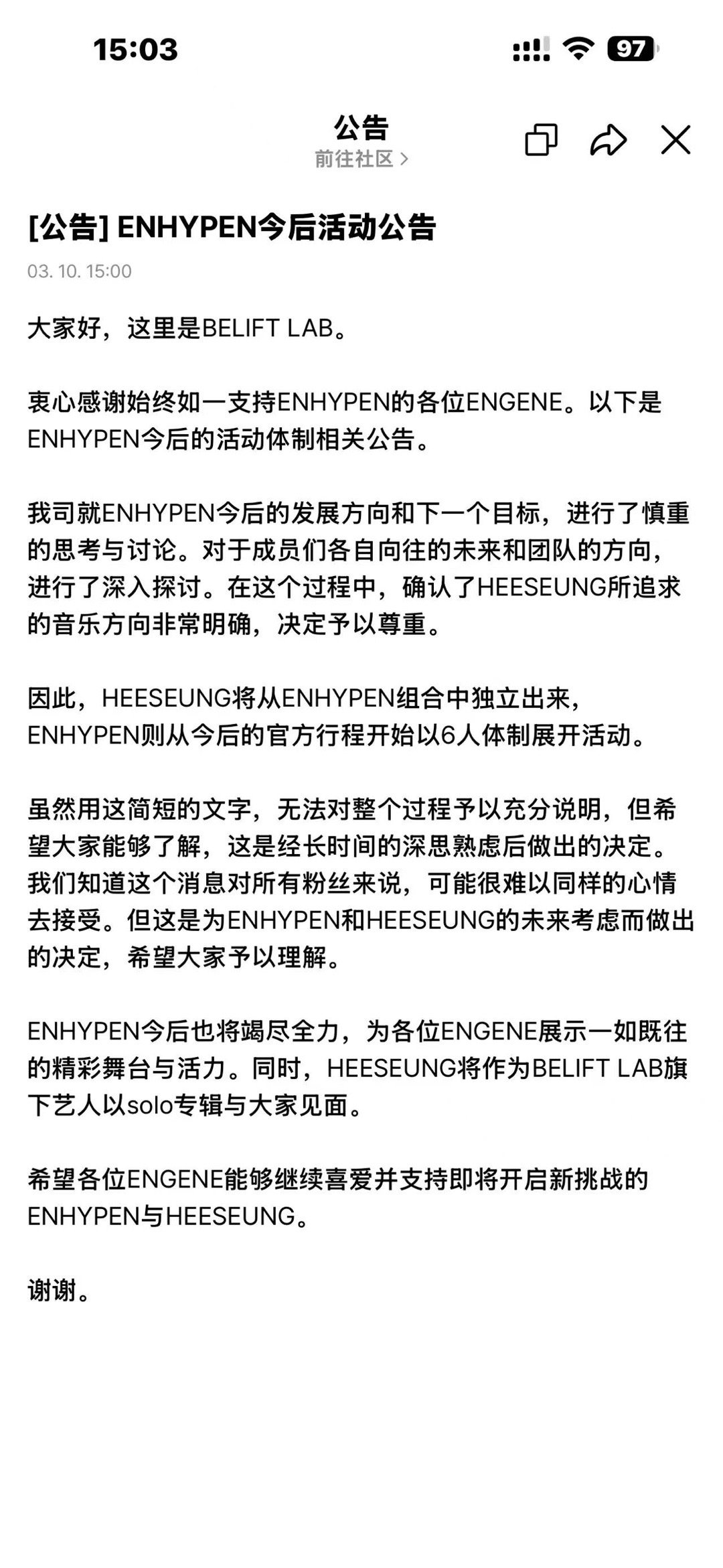 李羲承将solo李羲承退团ENHYPEN以六人体制活动