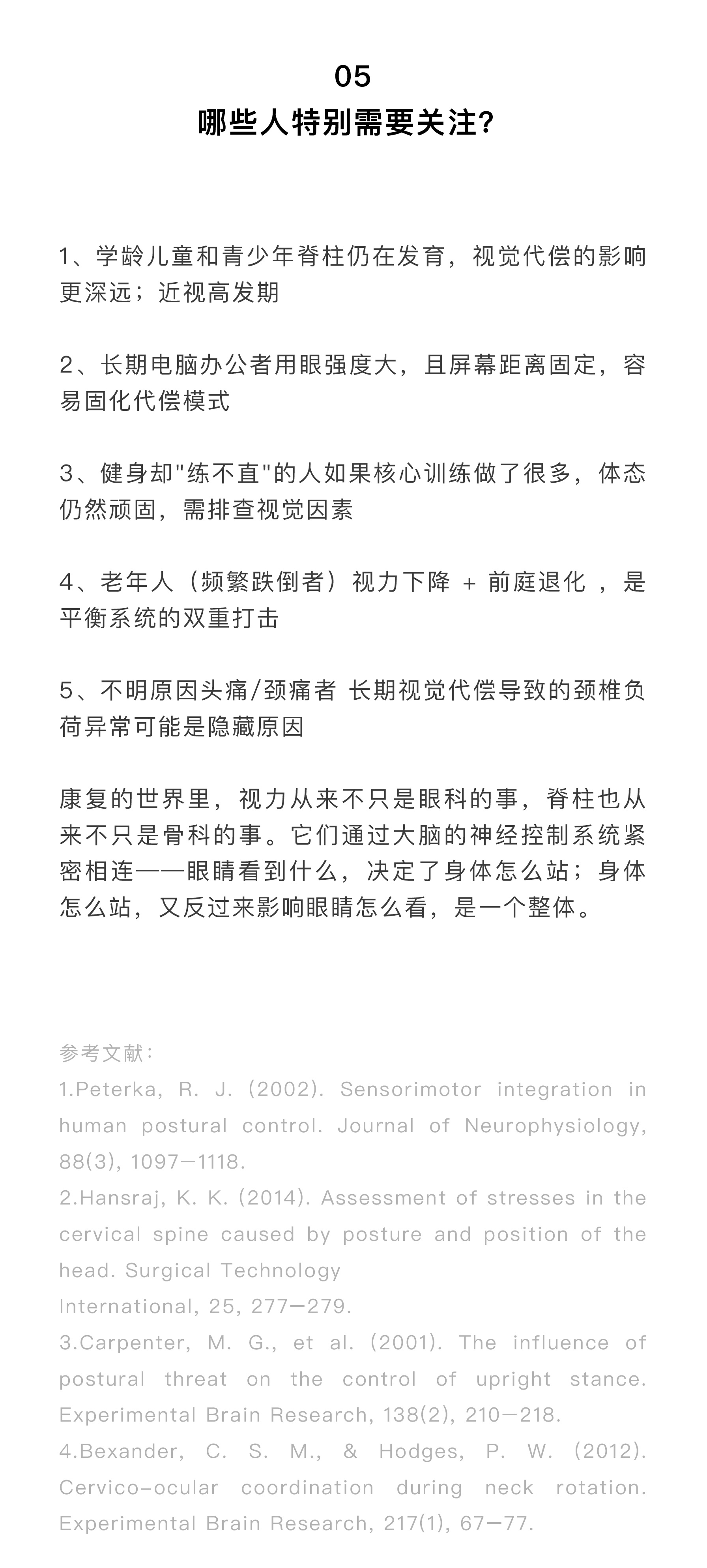 05【哪些人特别需要关注?】1、学龄儿童和青少年脊柱仍在发育,视觉代偿的影响更深远;近视高发期2、长期电脑办公者用眼强度大,且屏幕距离固定,容易固化代偿模式3、健身却"练不直"的人如果核心训练做了很多,体态仍然顽固,需排查视觉因素4、老年人(频繁跌倒者)视力下降 + 前庭退化 ,是平衡系统的双重打击5、不明原因头痛/颈痛者 长期视觉代偿导致的颈椎负荷异常可能是隐藏原因