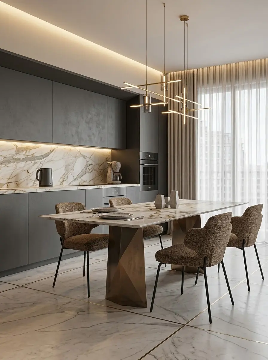 在材质的推敲上,质感极佳的深色木饰面、清雅的大理石纹理与温润的皮质、舒适的布艺(如餐厅的圈绒餐椅)巧妙融合。这种硬与软的碰撞,不仅凸显了专业的设计质感,更在细节中赋予了家一种真实生活化的慵懒与惬意。🛋️