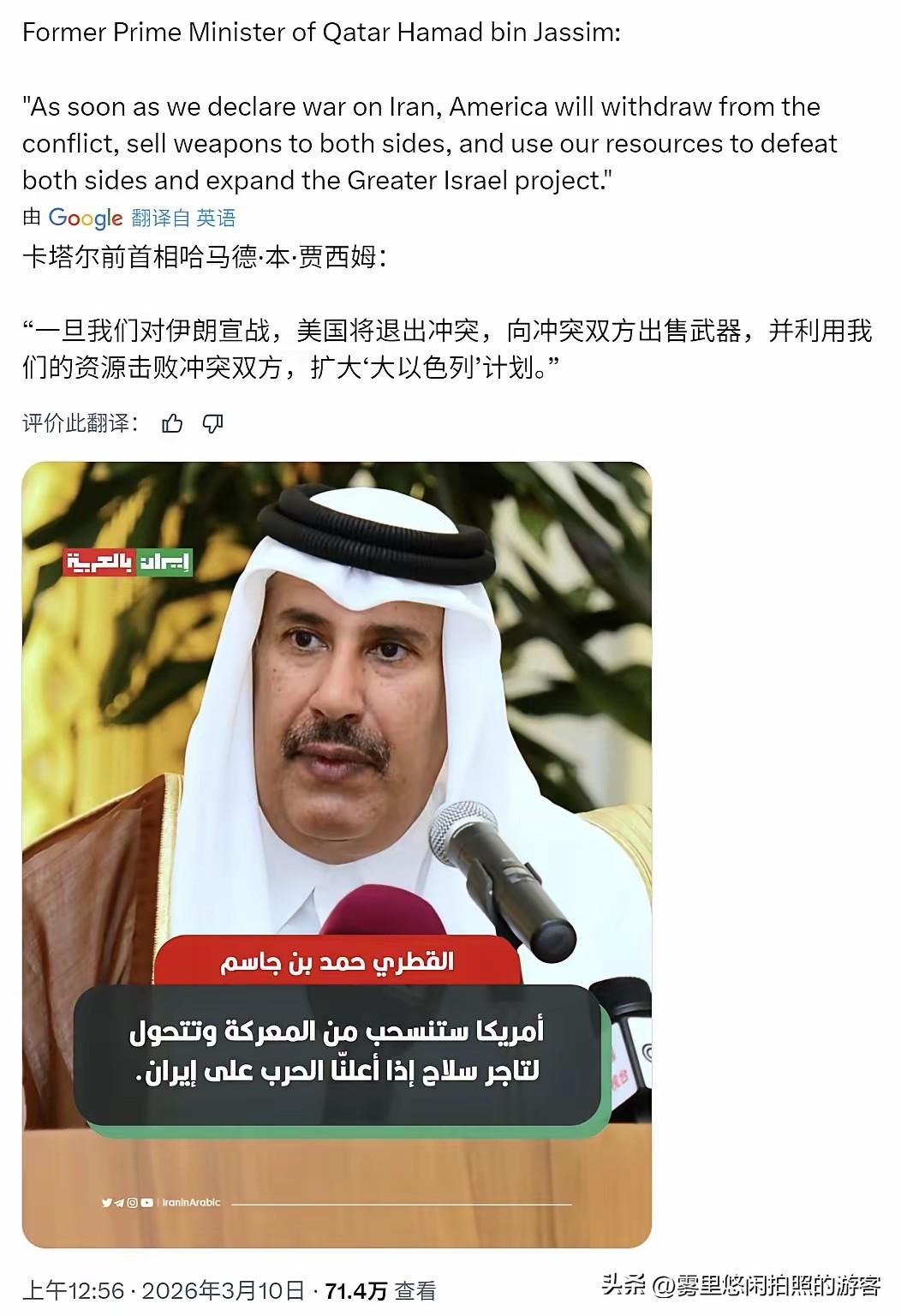 卡塔尔前首相:“一旦我们对伊朗宣战,美国就会退出冲突,向交战双方出售武器,并利用我们的资源击败双方,同时推进‘大以色列’计划。” 这番话没有半点修饰,直接把美国在中东玩了几十年的套路,扒得底裤都不剩。这不是凭空猜测,是深耕地缘多年的政客,用最清醒的口吻戳破霸权谎言。 美国在中东从来不是守护者,它是躲在幕后的军火商与操盘手。冲突一爆发,它立刻抽身离场,把枪火卖给两边,看着昔日盟友互相厮杀,自己稳赚军售暴利。 中东的油气、土地、生命,全成了美国实现野心的耗材。它要的不是和平稳定,是让这片地区永远乱下去,乱到所有国家精疲力竭,只能任由它拿捏。 所谓“大以色列”计划,就是美国绑定代理人、掌控中东咽喉的阴谋。用势力扩张压制地区自主力量,把整个中东绑在自己的战车上。 多少国家曾把美国当靠山,最后只落得家园破碎、资源耗尽。卡塔尔前首相敢说真话,就是给所有心存幻想的国家泼一盆冷水。 战场上流的是中东人的血,美国军工复合体却在万里之外赚得盆满钵满。把盟友当棋子,把战乱当生意,这就是霸权最赤裸的冷酷。 中东的未来,从来不该攥在外部强权手里,更不该在自相残杀里走向沉沦。清醒过来,才是这片土地真正的出路。 各位读者你们怎么看?欢迎在评论区讨论。