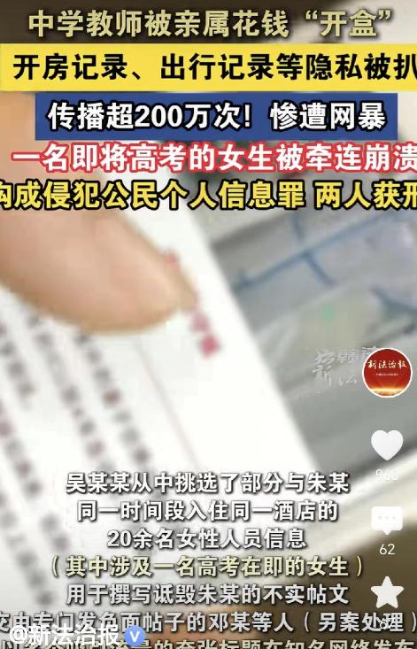 “太可怕了!”江苏,一男子是中学老师,因为和亲戚有矛盾,亲戚对他怀恨在心,亲戚为了报复,花13150块买到了男子住宿信息,并挑选同时段和男子住同酒店的女子信息,写成诋毁男子的帖子,用夸张标题在网上发布,帖子瞬间火了,被点赞转发200万次,男子被调查,一高三女学生也被牵扯进去,案件经过调查,法院判了! 事情闹大之前,朱某在学校的生活很普通。 他教书多年,作风低调,学生对他评价不错,同事也觉得他踏实。 家里的矛盾其实不复杂,无非是借款往来和分房争执积累的怨气。 一次争吵过后,亲戚吴某某越想越气,没有选择坐下来解决,而是动了歪心思。 他找到熟人商量报复办法,对方提出去查行程和住宿记录,再拼接成故事。 吴某某把朱某妻子的身份证号码提供出去,作为查询线索。 不久后,陈某某分批支付13150元,从他人手里买来1442条个人信息。 这些数据里有住宿登记、购票记录,还有与之产生时空交集的人员信息。 信息被筛选之后,吴某某专门挑出二十多名与朱某在同一时间段入住同一酒店的女性名字。 其中有一名正在备战高考的高三学生,只是外出正常入住。 几个人把零散记录拼在一起,添写细节,制造暧昧暗示。 帖子交到专门发布负面内容的人手里,对方改得更加吸睛,还设置了刺激标题。 内容在多个平台上线,很快突破两百万阅读互动。 电话开始不断打进朱某手机。 家长来询问,邻居围观,学校要求他写情况说明,暂停班级工作配合调查。 那名被点名的女生在自习时被叫到办公室,家长赶来时情绪失控。 学校连夜安排心理老师介入,班主任调整座位,减少外界干扰。 朱某选择直接报警,把聊天记录、转账凭证和时间线全部提交。 警方顺着转账流水锁定数据来源,发现背后有人以查询住店记录为名按条收费。 越详细的行程价格越高,黑色交易群里长期有人兜售。 发布账号的后台截图、拉群聊天记录、付款记录被一一固定。 调查结果显示,所谓同住只是同城同酒店,不同楼层,没有任何实质交集。 案件移送法院后,认定相关人员非法获取公民个人信息并用于编造传播不实内容。 吴某某被判有期徒刑十一个月,并处罚金二千元。 陈某某被判有期徒刑一年,同样罚款二千元。 供数者和协助传播者另案处理,涉事账号被平台永久封禁。 判决书下来那天,朱某在办公室坐了很久。 学校恢复他的教学安排,女生情绪逐渐稳定,按计划参加模拟考试。 家族群曾经吵成一团,后来慢慢沉默下来。 朱某没有再去争执,他把社交软件隐私权限调到最高,提醒学生不要随意填写表单,不随便透露行程。 他在班会上讲过一句话,网络上的热度很快。 围观的人轻轻一点转发,可能就是别人生活里的风暴。 事情过去后,社区里有人主动表达关心。 朱某的生活慢慢回到正轨。 这场风波留下的痕迹提醒很多人,个人信息并不遥远,酒店记录和出行数据一旦外泄,就可能被拼接成完全不同的故事。 矛盾本来只是家庭内部的争执,走向法律边缘只用了几步。 结果就铸成了大错。