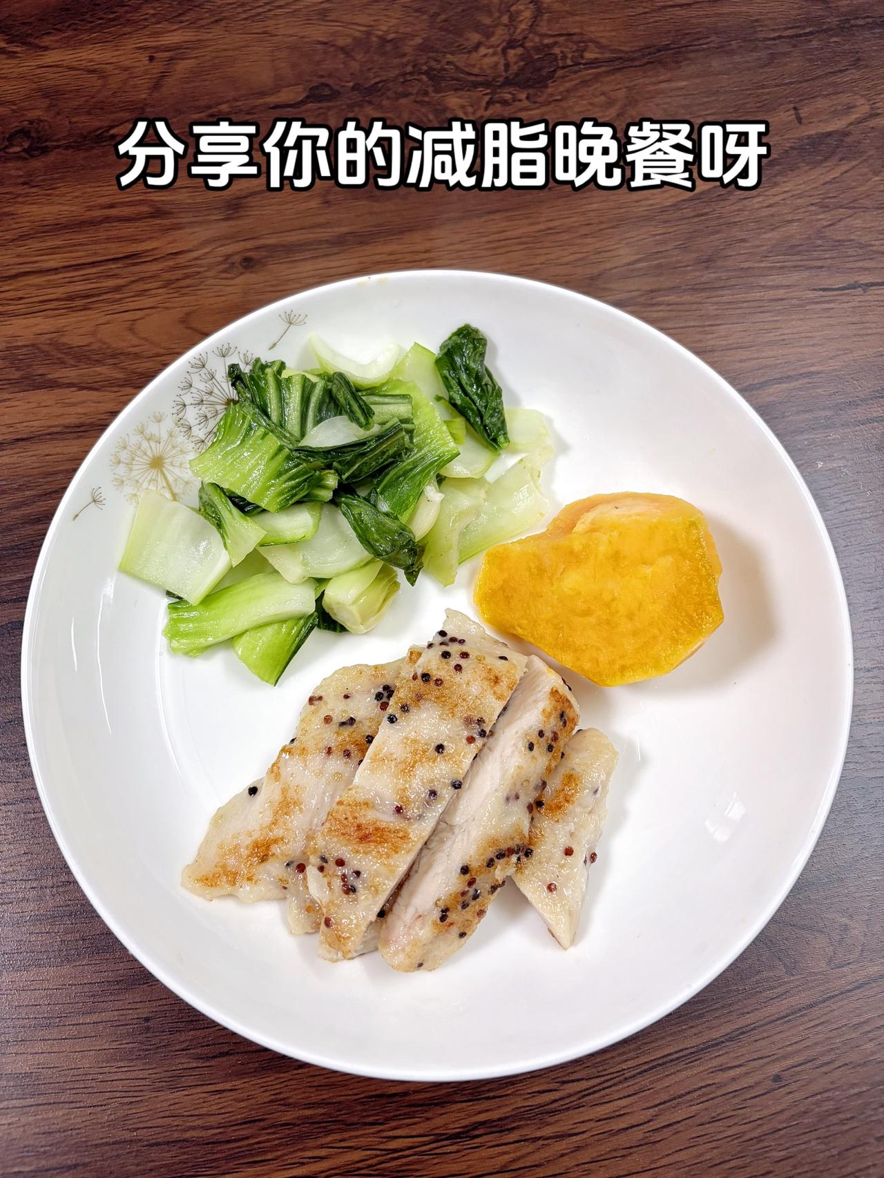 泪水打湿我的减脂餐,目标95斤,加油 今日减脂晚餐:煎鸡排+红薯+素炒青菜