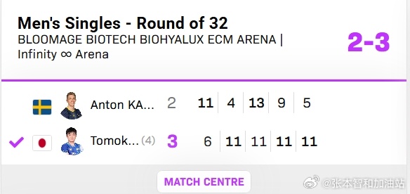 wtt重庆冠军赛2026 张本智和 260310 男单R32张本智和 3-2 卡尔伯格 (-6,4,-11,9,5)下一轮对手是宇田和阿萨尔间的胜者。