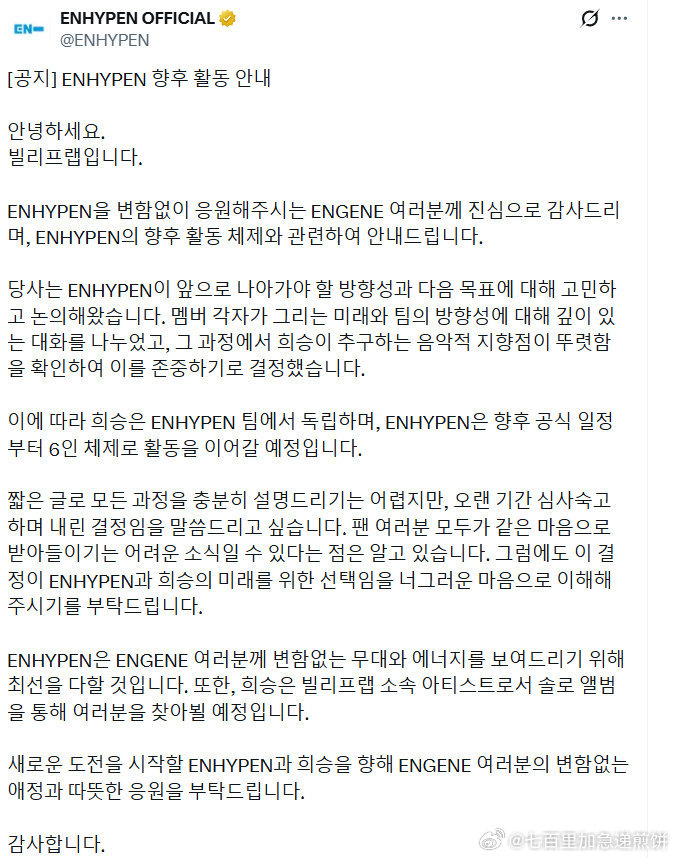 李羲承宣布退出ENHYPEN,将solo活动,ENHYPEN将以六人体活动(我?