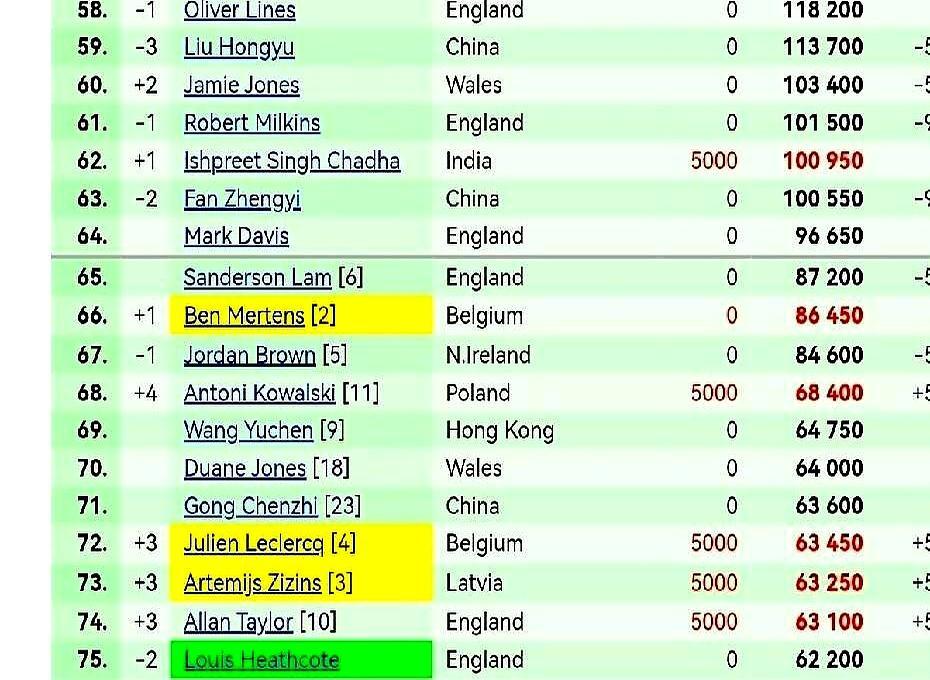 当年10比9掀翻奥沙利文拿欧洲大师赛冠军的范争一,现在差点保不住职业巡回赛资格。 他现在世界排名61,离64的保级红线就差3个位次,总奖金积分才10万9千英镑,刚结束的威尔士公开赛只涨了1位,加了3600分。 还好他两年前同期积分低,这次只需要扣5000分,身后追得紧的马克·戴维斯要扣1万5,暂时还能拉开差距。下个月的世锦赛资格赛是最后关口,只要打进第三轮拿1万积分,保级就彻底稳了。 靠巅峰老本扛不住周期起伏,拿当下战绩才能守得住职业席位。