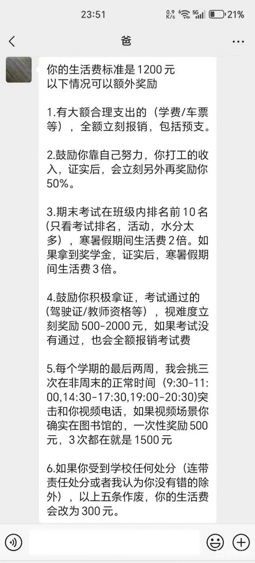 某大学生说家里给她1200元的生活费不够花,但可以有附带条件的增加,虽然她觉得挺不舒服,但还是接受了。