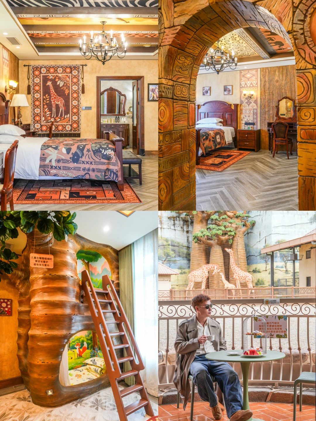 与长颈鹿仅隔着一到栏杆,感觉是把非洲草原风情搬进庄园庭院了,享受度假的惬意时光,房间的非洲风情,小朋友们超爱树屋,神秘感拉满且充满温馨的童趣。