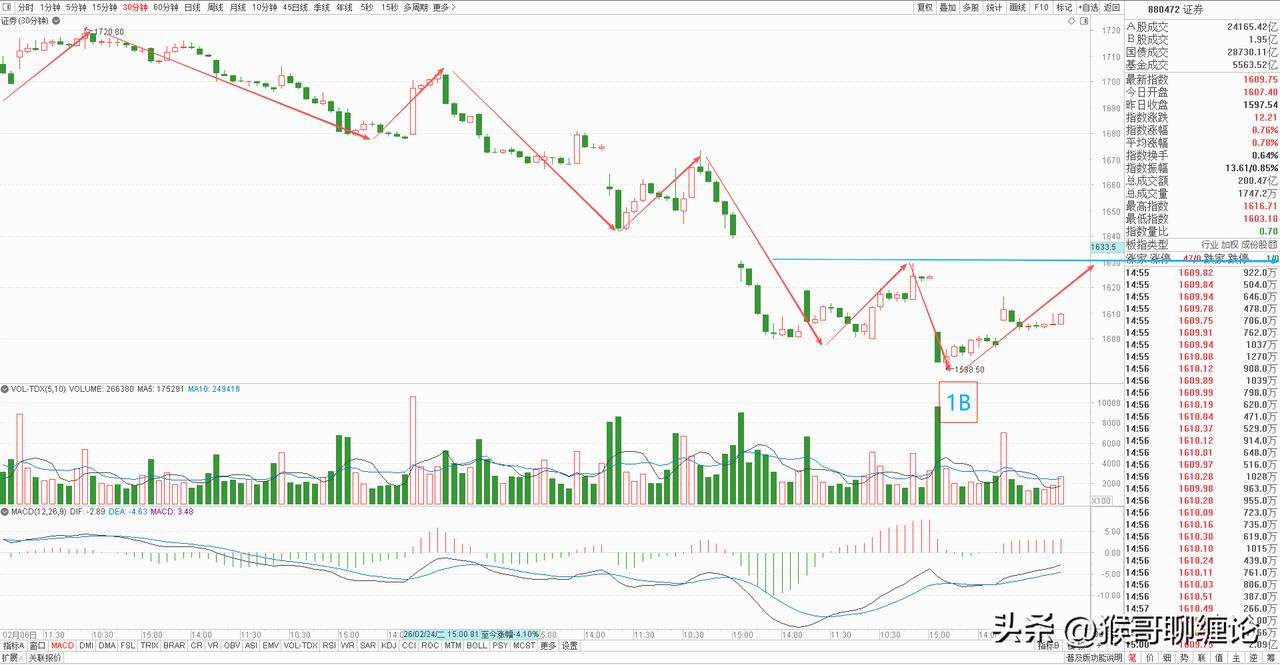 券商板块今天冲高回落,收了一根缩量小阳线,早盘做了一个小幅高开的动作,开盘便快速冲高,一举涨超1%,但未能伴随同步放量,资金承接不足,只能反身向下,随后便一直维持震荡下跌的走势,仅近尾盘才有所回升。虽然今天表现不够强势,但也算是给出了短线止跌信号,就看明天能否继续上行,封闭上方缺口,从而明确短线底部信号,开始新的上涨结构。 从30分钟图上看,目前走势和我们预期完全一致,处于背驰一买的拉升之中,目标就是前面高点附近,只要突破这个位置,那再回调下来就能构建二买,从而带动短线级别完成止跌确认。