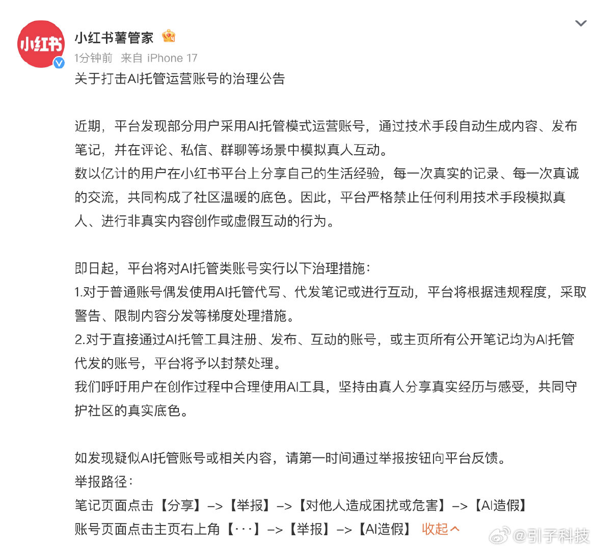 即日起,平台将对AI托管类账号实行以下治理措施:1.对于普通账号偶发使用AI托管代写、代发笔记或进行互动,平台将根据违规程度,采取警告、限制内容分发等梯度处理措施。2.对于直接通过AI托管工具注册、发布、互动的账号,或主页所有公开笔记均为AI托管代发的账号,平台将予以封禁处理。我们呼吁用户在创作过程中合理使用AI工具,坚持由真人分享真实经历与感受,共同守护社区的真实底色。各位网友,您怎么看?