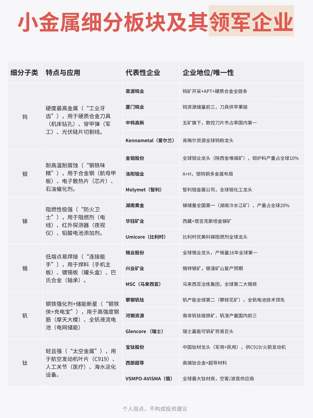 今天咱们就聊聊小金属。小金属被称作是“隐形刚需王者”,藏在工业链条关键环节。按照申万行业分类,稀土其实也属于小金属,但它比较复杂,之后单开一期去讲。