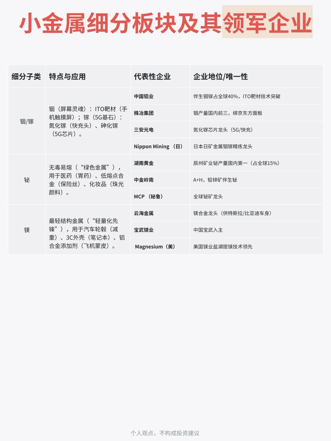 我们常说的有色金属,其实包含了五大类[清单R],分别是:贵金属(金、银、铂族,保值避险“硬通货”)、能源金属(锂、钴、镍,新能源电池“心脏”)、小金属(稀有“小个子”,储量少、用途专一)、金属新材料(普通金属升级款,如钛合金、磁材)、工业金属(铁、铜、铝等大宗“老大哥”,基建主力)。其中,小金属是“隐形刚需王者”,藏在工业链条关键环节。