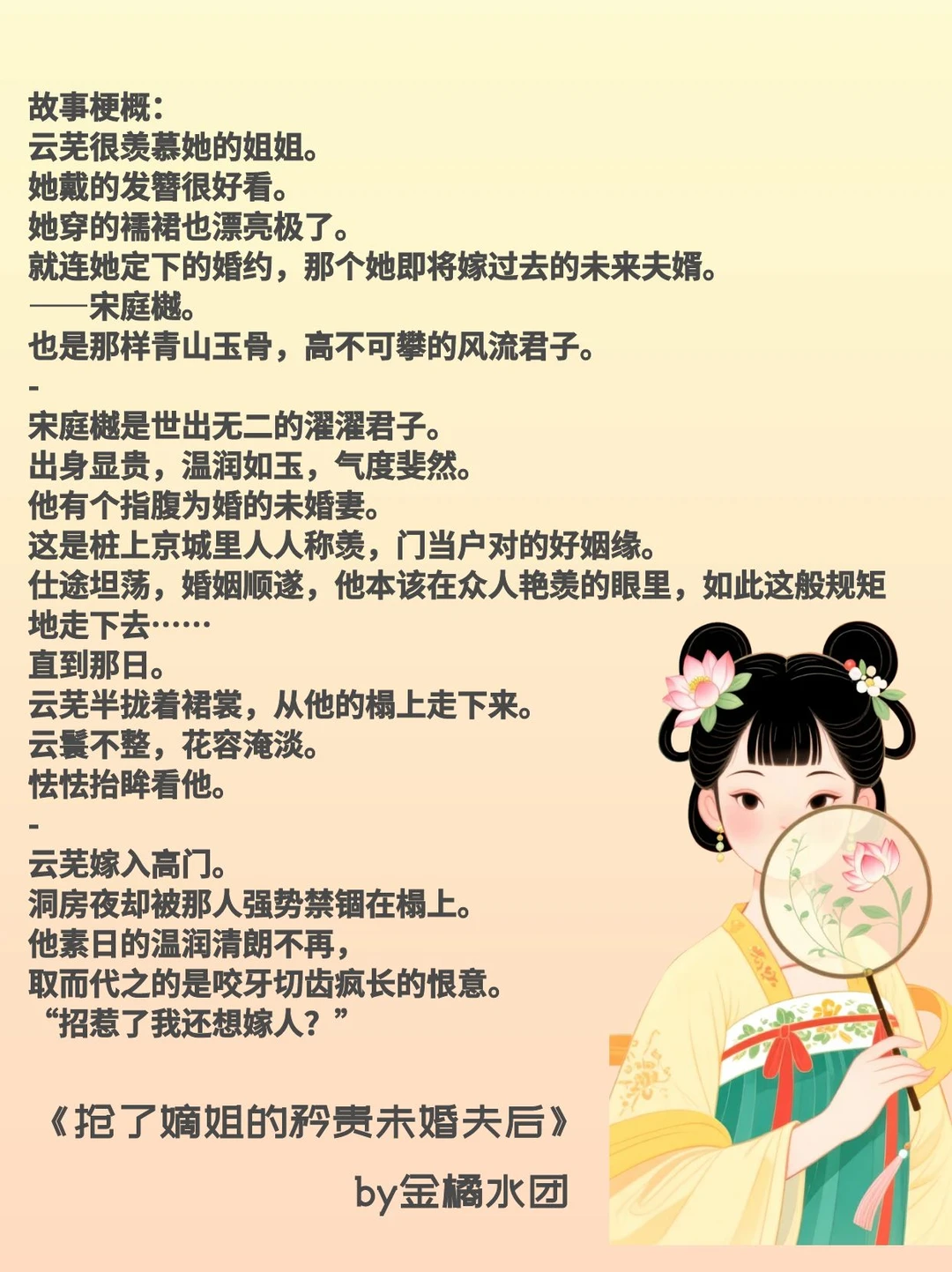 [烟花R]心机钓系 x 清冷隐忍 [烟花R]古言/宫廷侯爵/女撩男/追妻/复仇/打脸 [种草R]故事设定还蛮狗血的,女主是个不受宠的庶女,看似是“嫉妒”嫡姐的一切,包括未婚夫男主,才去撩男主的;但更深层的原因却是女主从小就遭受不公,想为自己争取。 [种草R]作者在女主身上投射了一种不服输、倔强的精神,面对不公,选择自己去反转人生。 [种草R]男女主的感情也蛮好品的,男主真的是个端方君子,但面对女主的时候,从一开始的厌恶,到理解女主后的情有可原,再到想要引导女主,最后一点点心动,逐步被拉下神坛的整个过程,都非常有张力。