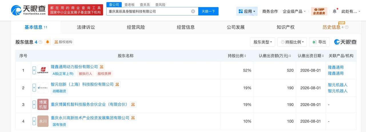 隆鑫通用、智元机器人等成立具身智能科技公司 注册资本1000万 天眼查工商信息显示,近日,重庆昊辰具身智能科技有限公司成立,法定代表人为李科,注册资本1000万人民币,经营范围包括智能机器人的研发、工业机器人制造、人工智能理论与算法软件开发、服务消费机器人制造等。股东信息显示,该公司由隆鑫通用(603766)、智元机器人关联公司智元创新(上海)科技股份有限公司、重庆博翼机智科技服务合伙企业、重庆永川高新技术产业投资发展集团有限公司共同持股。 天眼查信息:
