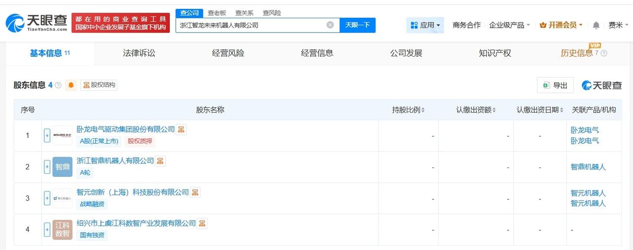卧龙电驱、智元机器人等成立智龙未来机器人公司 注册资本2000万 天眼查工商信息显示,3月10日,浙江智龙未来机器人有限公司成立,法定代表人为姜青松,注册资本2000万人民币,经营范围包括智能机器人的研发、工业机器人制造、服务消费机器人制造、人工智能理论与算法软件开发等。股东信息显示,该公司由卧龙电驱(600580)、智元机器人关联公司智元创新(上海)科技股份有限公司、浙江智鼎机器人有限公司、绍兴市上虞江科数智产业发展有限公司共同持股。 天眼查信息: