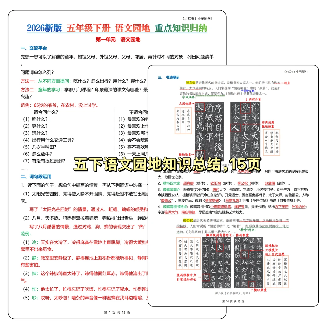 宝子们!五年级下册语文园地的知识点,考试里超超超关键,直接关系到提分,赶紧码住!💯 一共15页。需要注意的是,五下的第三单元是活动单元,是没有语文园地的。 这些知识点,狠狠记住,考试提分稳稳的~ 📚 🛍️左下角店铺获取。 ⚠️拍过五下每课知识点的宝子就不要拍这份了哈,每课知识点包含这份语文园地知识点的。