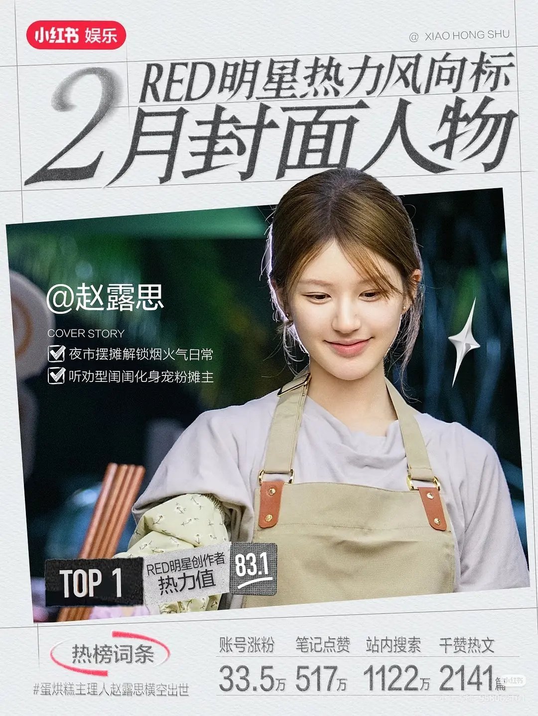 赵露思小红书2月封面人物第一连续9月上榜前二6个月第一在2400万粉丝基础下