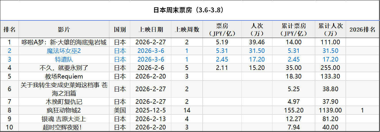 日本周末票房(3.6-3.8):1.《哆啦A梦:新·大雄的海底鬼岩城》蝉联冠军,累计票房14亿日元;2.《魔法坏女巫2》在新片中表现最佳;3.《疯狂动物城2》累计票房155.2亿,超越《崖上的波妞》排名日本影史第17;4.《国宝》累计票房203.4亿,超越《航海王:红发歌姬》排名日本影史第8。(数据来源:kogyotsushin、dorama)