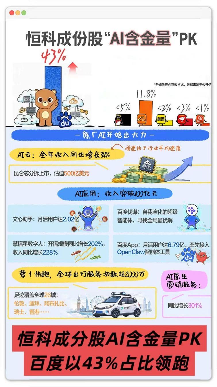 虎嗅那篇文章说对了,百度是该被重新估值 上周木头姐又出手了——超1200万美元加仓百度。为什么资本市场一直这么看好百度? 虎嗅有篇文章或许给出了答案:“给AI赛道上的选手估值,不论传统业务多赚钱,应优先考虑AI业务的前景,而不是纠结于当期利润。按旧逻辑估值的百度,或被低估。” 问题就出在这里。市场还在用传统的PE框架给百度称重,盯着搜索业务的利润表打转。但翻翻百度的业务版图,AI早已不是锦上添花的配角,而是实实在在的主干。 最容易被忽略的,是百度手里两张独立王牌。 一张是萝卜快跑。全球订单量超2000万,在26座城市落地,单程成本控制在3万美元以内。对比一下,特斯拉的无人出租车还在小规模测试阶段,资本市场却给了它超1500亿美元估值。萝卜快跑的真实价值,显然没有被充分定价。 另一张是昆仑芯。已经进入IPO阶段,中金直接给出500亿美元估值。这颗芯片是百度全栈AI布局的底层支撑,独立出来也是一家独角兽。 再往深处看,百度的核心AI业务已经撑起半边天。2025年AI业务营收400亿,营收占比从Q3的39%跃升到Q4的43%,单季度提升近5个百分点。按这个节奏,到2028年AI贡献将超过70%。 具体业务更是一个比一个能打:2025AI云全年收入同比增长34%,百度智能云连续两年在大模型招投标中中标项目数、金额双第一;AI应用收入突破100亿,秒哒帮全球用户生成超100万个应用,文心助手月活3.6亿稳居行业第一;AI原生营销服务收入同比暴涨301%,说明AI真的能帮客户赚钱。 把这些拼在一起,百度已经不是传统意义上的互联网公司。它手里握着智能云、无人驾驶、AI应用、芯片——每一条都是独立的增长曲线。对这样的AI平台型企业,分部估值才能算出真实价值。 木头姐的增持,或许就是在下注这个认知差。百度的估值逻辑,确实该跟着AI业务一起刷新了。 百度 百度AI 全栈 百度股价 昆仑芯 百度智能云