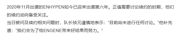 enhypen原定明年续约 10日,enhypen李羲承退队,组合将以6人进行活动。据悉组合2020年出道,将于明年11月迎来续约期,队长梁祯元曾回应对于续约目前尚未进行任何讨论,会为了给ENGENE带来好结果而努力。