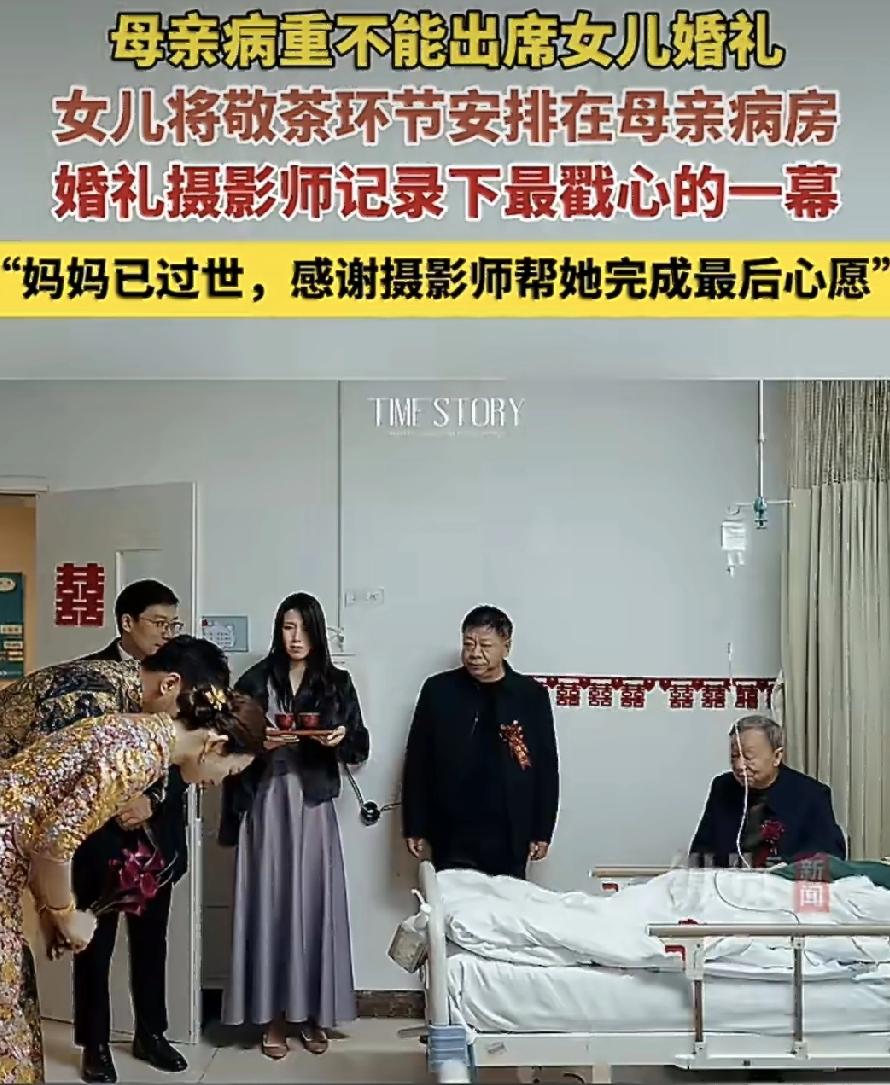 河北邯郸,一个婚礼摄影师拍下最戳心的一幕。婚礼现场不在酒店,在医院的病房里。 新娘子穿着秀禾服,走到病床前,轻轻喊了一声“妈”。床上躺着的母亲,身体已经很虚弱了,但还是努力睁开眼睛,看着自己的女儿。 女儿就在床边,给妈妈敬茶。 摄影师说,从业这么多年,第一次拍这样的婚礼。以前总觉得,影像的意义就是把最完美的那一瞬间留住。今天才明白,那些不完美的、带着眼泪的瞬间,才是最真实的爱。 新娘后来在评论区留言:妈妈已经走了。谢谢摄影师,帮我和妈妈完成了最后的心愿。 有网友说:希望她是真的幸福,而不是为了父母。 还有人说:让女儿出嫁,是妈妈最后的心愿啊。 看着妈妈那个努力睁眼的动作,眼泪真的绷不住。她一定很想亲眼看看,女儿最美的样子吧。 母亲病重女儿将婚礼敬茶安排在病房