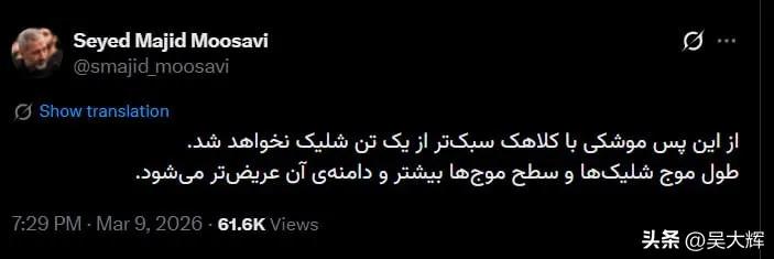 吴大辉教授竟然泄露伊朗的秘密了 我国著名的俄罗斯问题专家,清华大学国际关系学系教授吴大辉先生刚刚发表文章:《伊朗伊斯兰革命卫队空天部队司令穆萨维宣布,伊朗今后将只使用弹头重量1吨及以上的重型导弹打击目标》,我觉得咱们的吴教授不应该把伊朗这么重要的秘密泄露出来,这样一来,不但全世界都知道,就连我们这样东大的小民都知道了。 吴大辉教授还具体的写道,“从现在起,不会再发射任何弹头重量低于1吨的导弹。打击间隔将会拉长,但打击的规模和威力将大幅增强。” 这在伊朗应该是相当级别的军事秘密,伊朗伊斯兰革命卫队空天部队司令穆萨维应该是在一定层级一定范围内宣布的,特别不应该让美国和以色列知道,希望咱们的吴大辉教授也要帮助伊朗做好保密工作。 因为这样一公开,等于让美国和以色列知道了伊朗的常规导弹已经不多了,只剩下一些一吨以上的大家伙,可能10天半个月才能发一颗,当然这大江湖如果真的打起来也是很厉害的,特朗普和内塔尼亚湖知道了以后,他们会有所准备的。