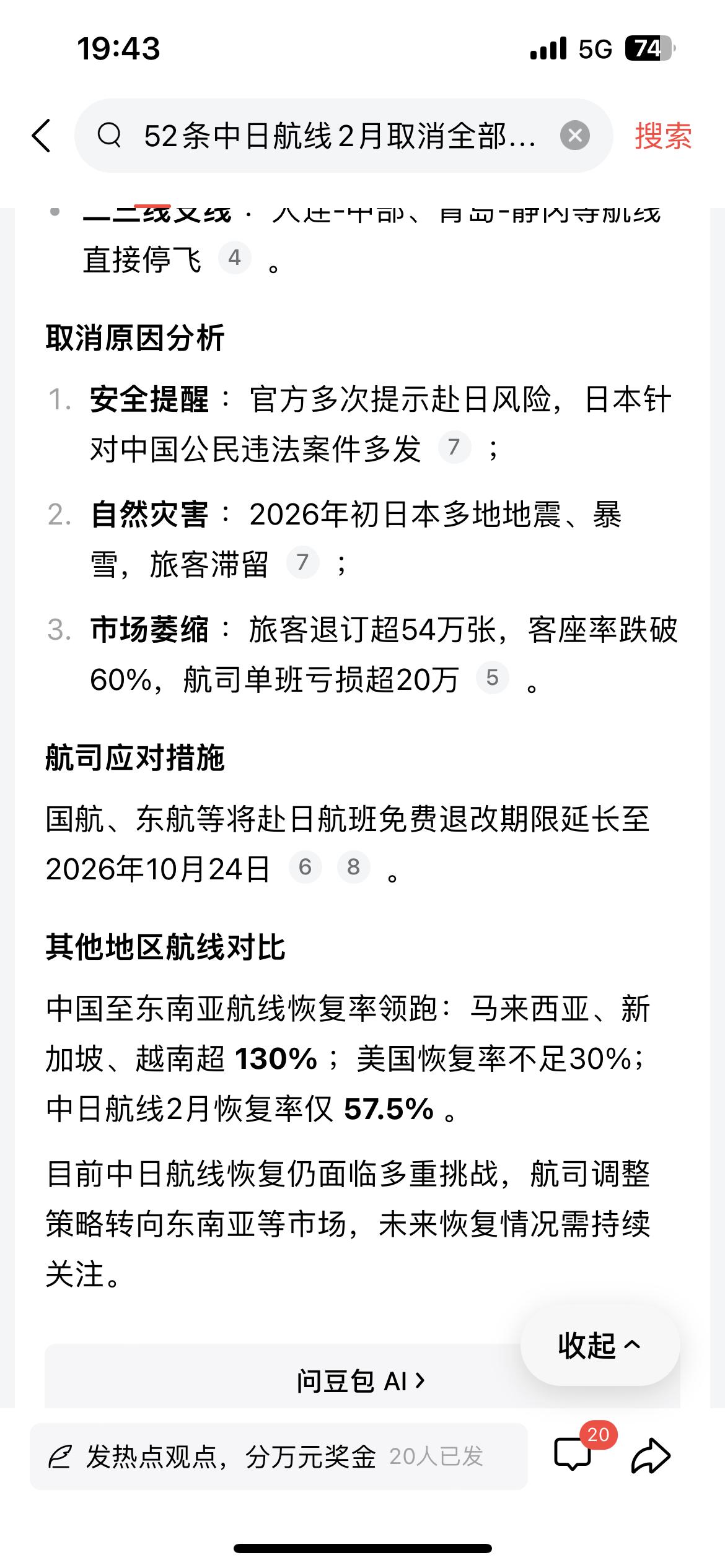 取消52条中日航线,2月份的航班全部取消,简直太对了!对于日本就好特殊时期要用非常手段! 其实让日本首相叫嚣出那句“台海有事就是日本的存亡危机事态”!我们就应该对待日本像“秋风扫落叶般的无情”! 借用网上的一句话,对于日本“无爱可破情局,无情可破全局”,对于日本就是要“无情可破全局”!真的,对日本一点都不要留情面,对于“蹬鼻子上脸”的行为必须大嘴巴子扇回去!
