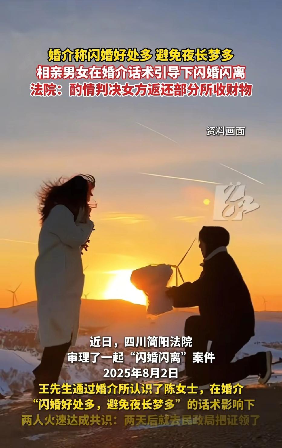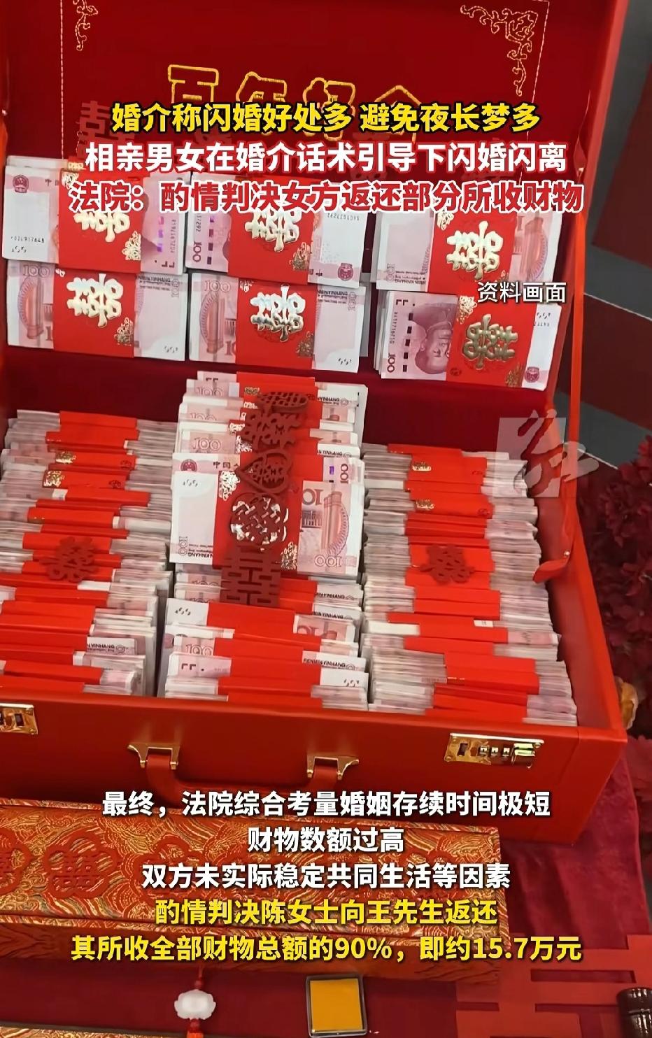 四川成都,男子心急想结婚,婚介认识一女子不到2天,婚介称闪婚好处多,男子轻信忽悠火速领证,男子为促成婚事,向女方转账17万彩礼。婚后二人聚少离多,感情彻底破裂,仅4个月便离婚。男子怒诉法院,要求全额返还彩礼,法院这样判了! 王先生怎么也想不到,自己一心盼着成家,却因为一时心急,被婚介机构的花言巧语牵着鼻子走。 短短两天领证,才四个月离婚,17万血汗钱险些打水漂。 王先生年事渐长,看着身边同龄人纷纷成家生子,父母更是整日为他的婚事忧心忡忡。 巨大的年龄焦虑和家庭压力,让他对婚姻的渴望变得无比迫切。 为了早日脱单,王先生主动找到一家婚介机构,希望能借助专业平台寻得良缘。 他满怀信任地将自己的需求告知对方,殊不知,自己的焦虑与真诚,在追求业绩的婚介眼中,不过是促成交易的筹码。 没过多久,婚介便安排他与陈女士见面,两人从陌生到相识,仅仅相处了不到两天时间,连对方的脾气秉性、生活习惯都没摸清楚,更谈不上深入了解。 正常而言,婚姻大事理应慎之又慎,可婚介机构为了快速促成订单,开始对王先生展开轮番洗脑。 他们不断鼓吹闪婚的好处,反复强调“相处久了矛盾多,夜长梦多容易黄”,一口咬定两人十分般配,趁热打铁领证才是最佳选择。 本就被年龄焦虑裹挟的王先生,在婚介接连不断的忽悠下,彻底丧失了理性思考的能力,他天真地相信,这就是命中注定的缘分,错过了便再难遇见。 被冲昏头脑的王先生,在相识不足48小时的情况下,毅然与陈女士办理了结婚登记。 为了表达自己的诚意,也为了牢牢抓住这段“来之不易”的婚姻,他毫不犹豫地向陈女士转账17万元作为彩礼。 那一刻,他满心都是对未来生活的憧憬,以为自己终于摆脱了单身,即将开启安稳幸福的婚姻生活。 然而,幻想有多美好,现实就有多残酷。婚后的生活,完全偏离了王先生的预期。 他与陈女士之间本就没有感情基础,婚后更是聚少离多。同年11月分居,婚姻也就维持4个月。 王先生无奈,只好起诉到法院要求离婚,并索赔全部财物。 法院审理后认为,双方婚前缺乏了解,婚后也未建立起真正的夫妻感情。 鉴于婚姻关系存续期间较短,涉及的财物应认定为以长期共同生活为条件的赠与。 现双方婚姻关系已解除,赠与所附条件未能成就,若由女方全部收下财物,略失公平,亦会助长不良社会风气。 《民法典〉》第5条规定,双方办理结婚登记手续但确未共同生活,当事人请求返还按照习俗给付的彩礼的,人民法院应当予以支持。 最终,法院判决准予离婚,判令陈女士返还王先生财物17余万元的90%,共计人民币15.7万元。 这件事也让大家明白,婚姻从来不是越快越好,更不能被焦虑、催促、忽悠牵着走。 真正稳定的婚姻,一定建立在互相了解、性格磨合、三观契合的基础上。 相识两天就闪婚、没看清对方就给付大额彩礼,既是对自己不负责,也容易埋下矛盾和纠纷的隐患。 对此,你怎么看?