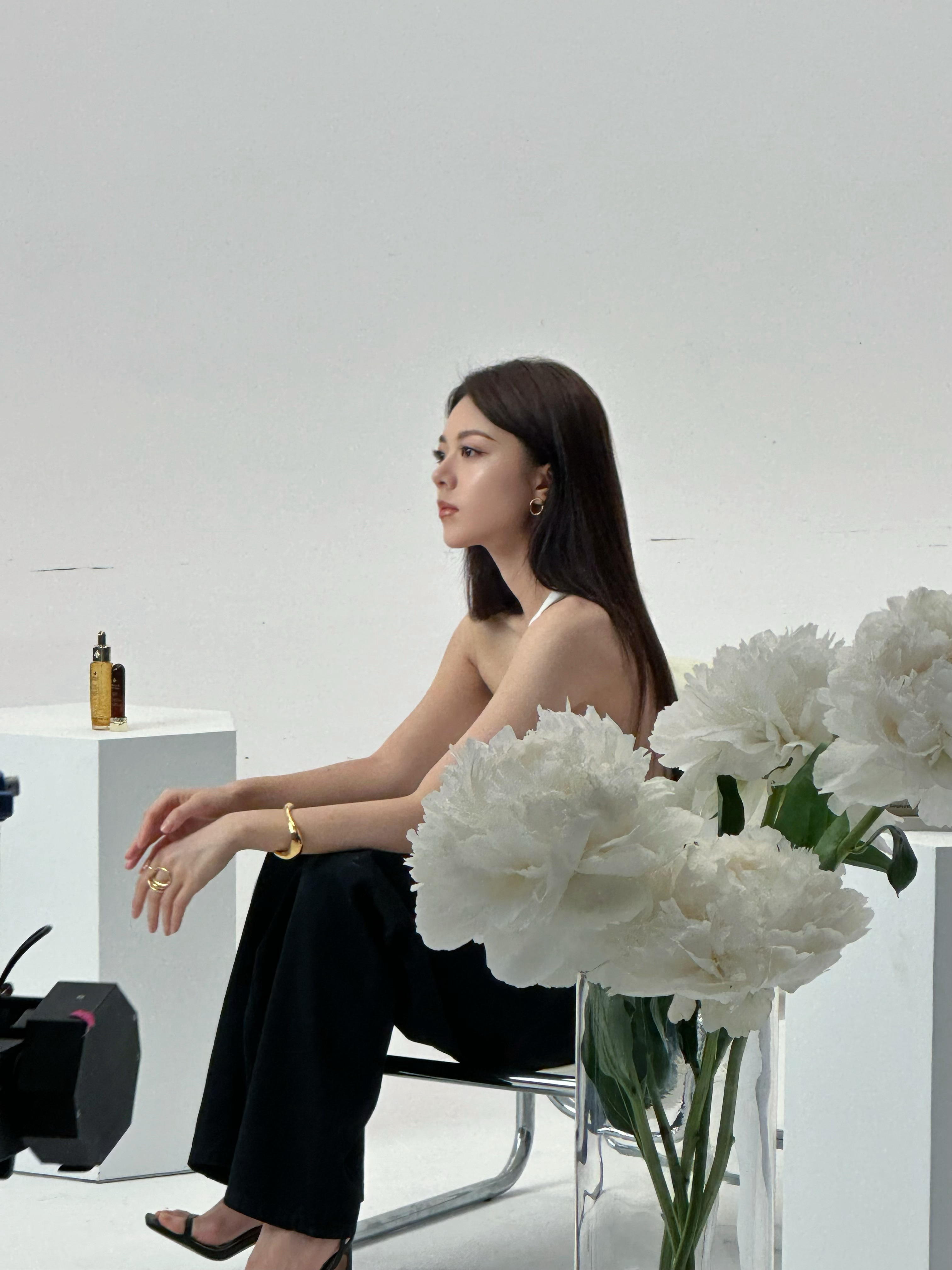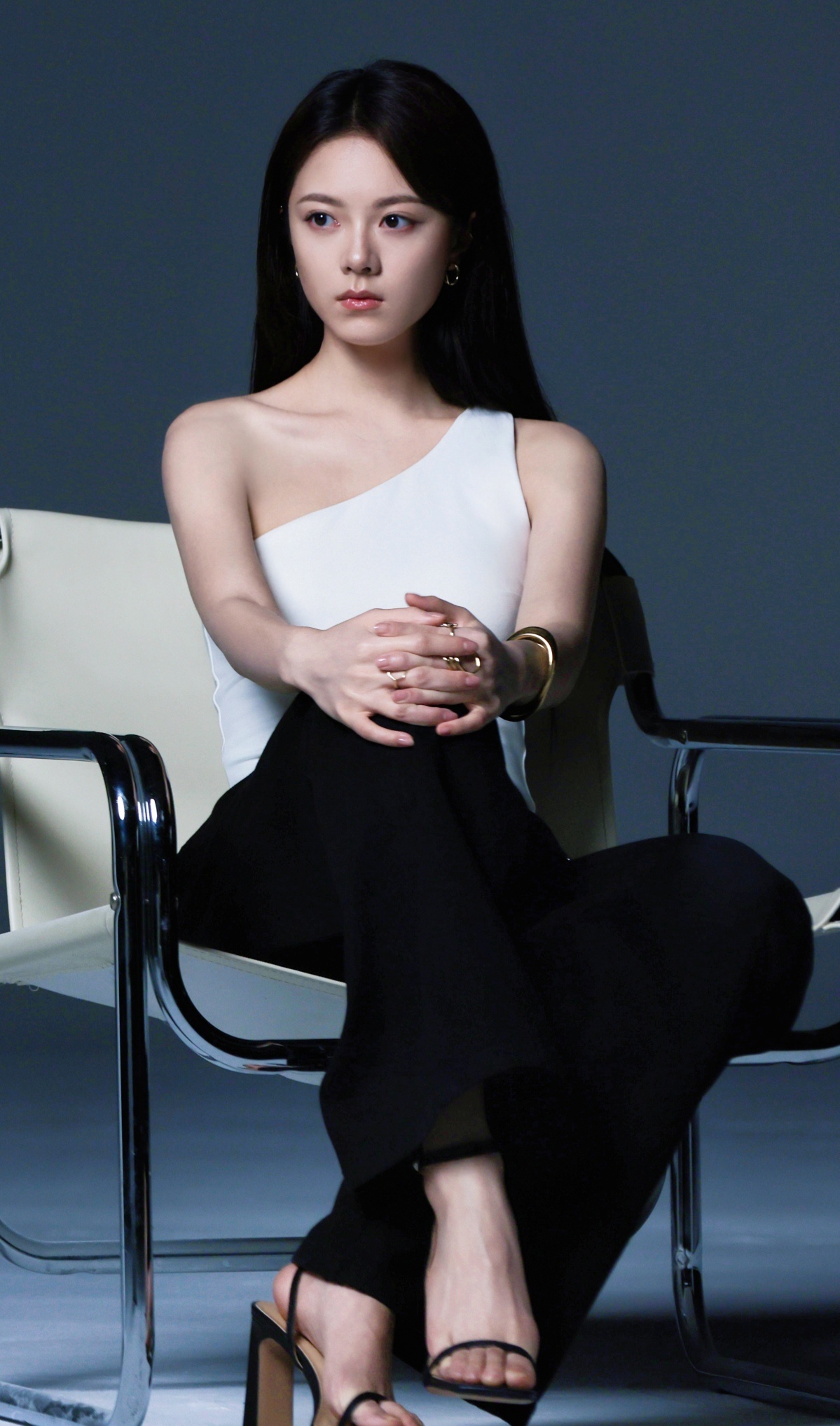 赵今麦镶钻围裙造型幂幂白色斜肩背心黑色西裤 黑色一字带高跟鞋